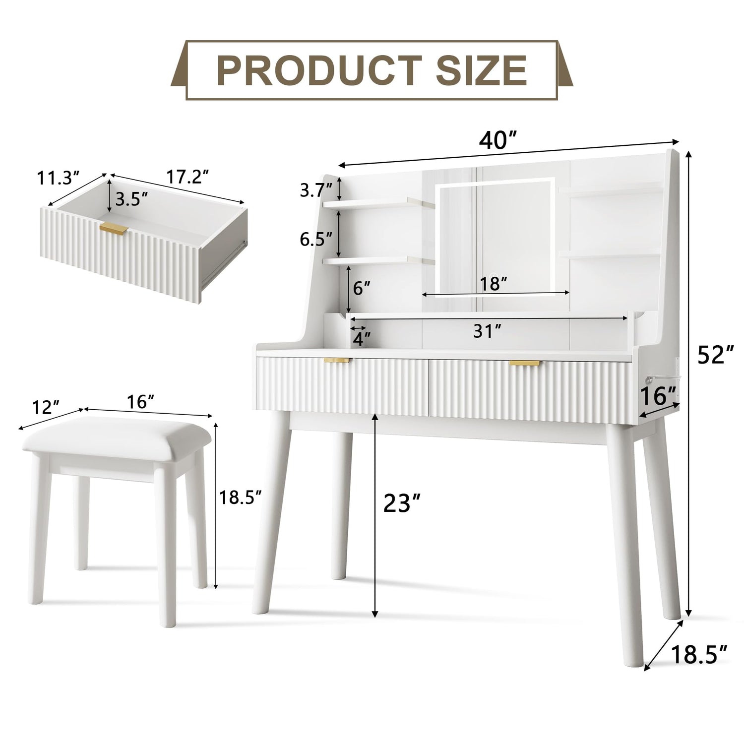 Einhomn Vanity Desk with Mirror & LED Lights, Fluted Makeup Table Set with Power Outlet & Hair Dryer Rack, Modern Dressing Table with Drawers & Adjustable Shelves, Cushioned Stool for Bedroom, White
