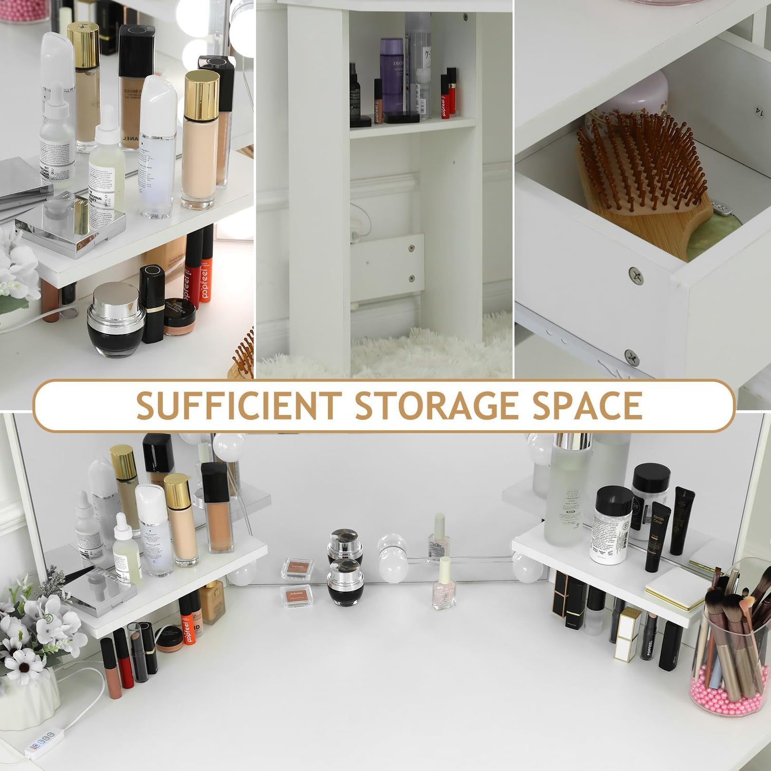 - 【Durable Material】This corner vanity table is composed of engineered wood, high-quality thick particle board and tri-fold mirror with dimmable lights, which is durable and not easy to bend; smooth surface with waterproof coating, easy to clean and anti-scratch. Stable structure can support enough weight. Anti-slip feet and anti-tip device increase safety.