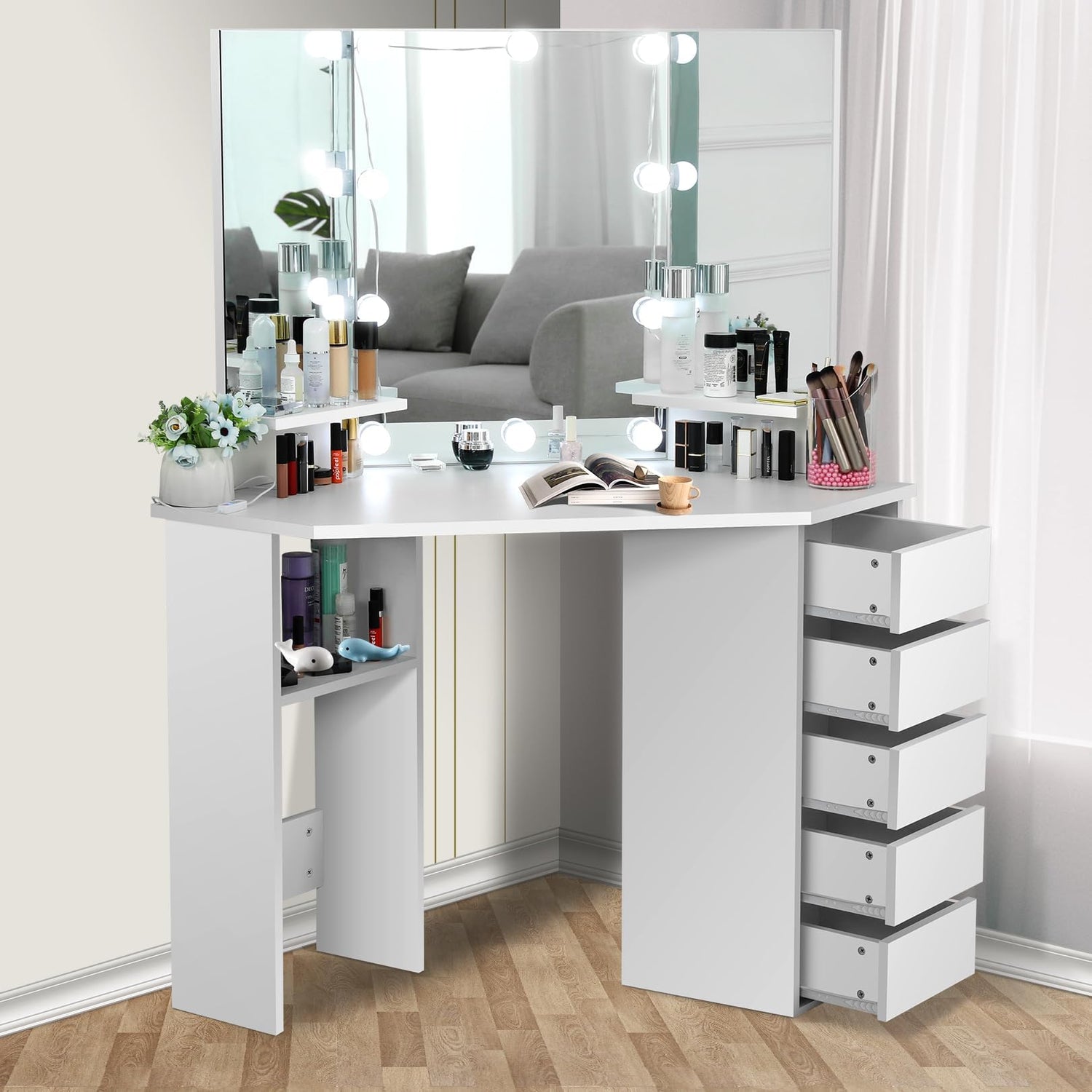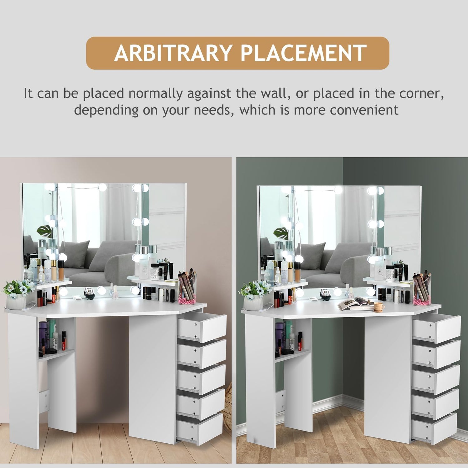 elifine Vanity Desk with Mirror and Lights, Makeup Corner Vanity with 5 Storage Drawers Shelves and 3 Dimmable Lighting Options and Vanity (White)