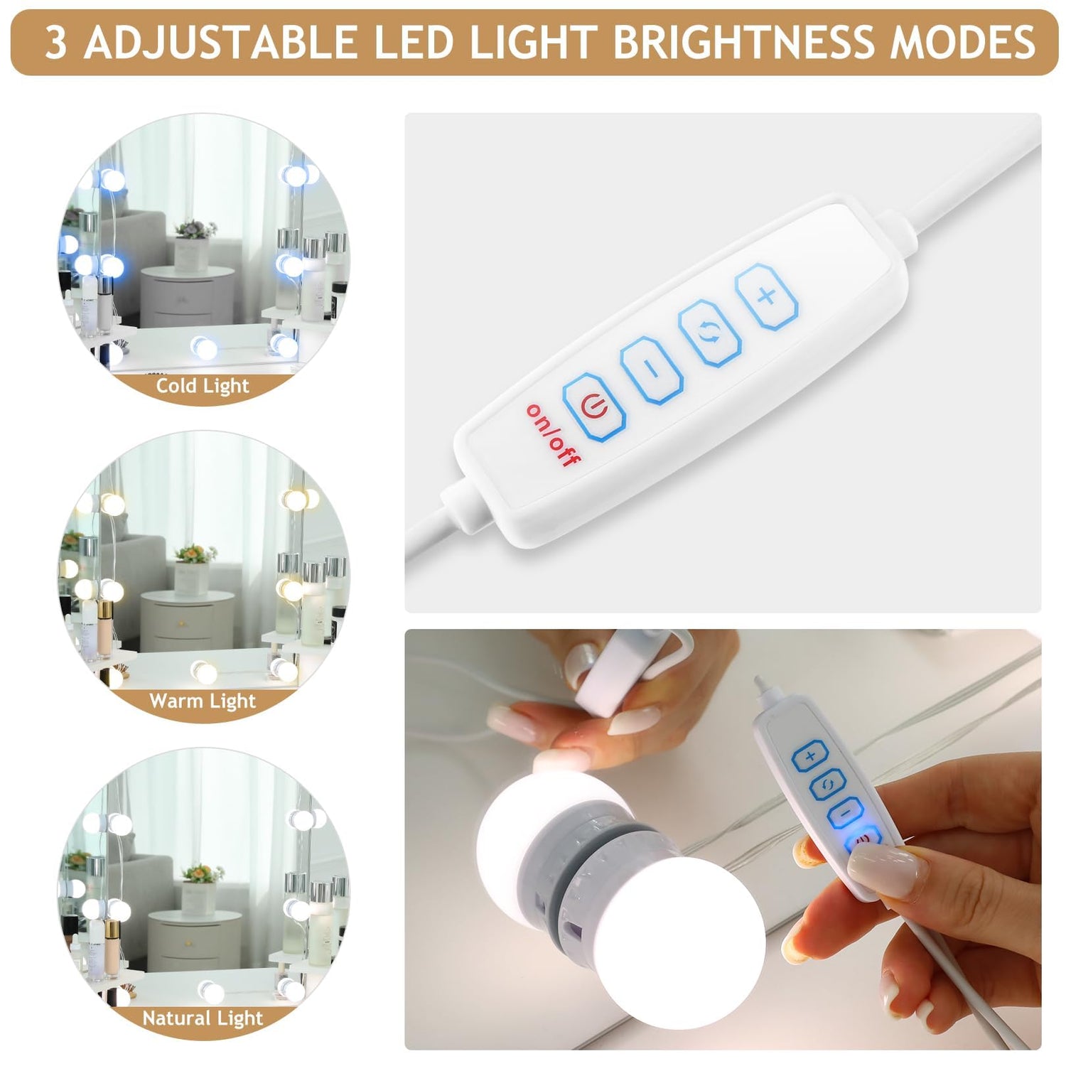 - 【3 Colors Adjustable LED Lights】This glowing mirror vanity has 3 colors of LED lights: natural light, warm light and cool light. 10 bulbs with USB ports with 3 levels of brightness, you can place them freely on the large clear mirror, easily create a modern and elegant vanity in your home.