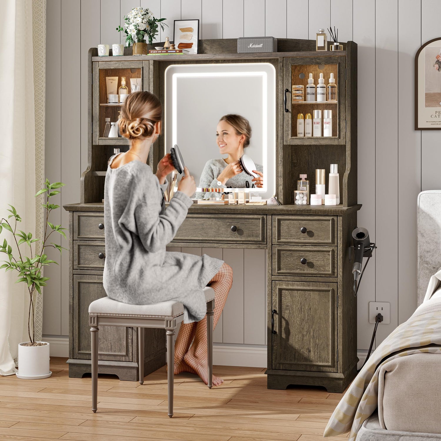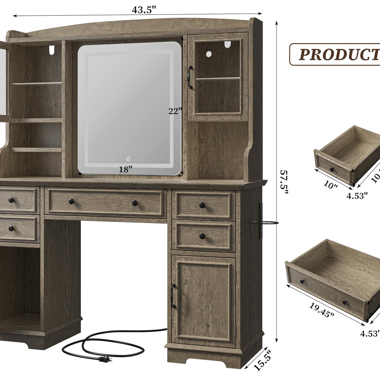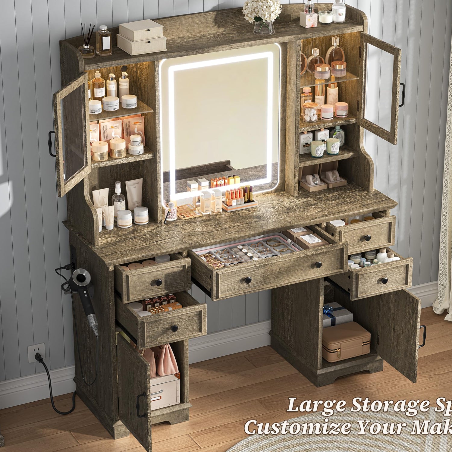 EnHomee Farmhouse Vanity Desk with LED Lighted Mirror, Makeup Vanity Table with RGB Cabinets and Lots Storage, 5 Drawers and 6 Storage Shelves for Bedroom and Dressing Room, Dark Oak