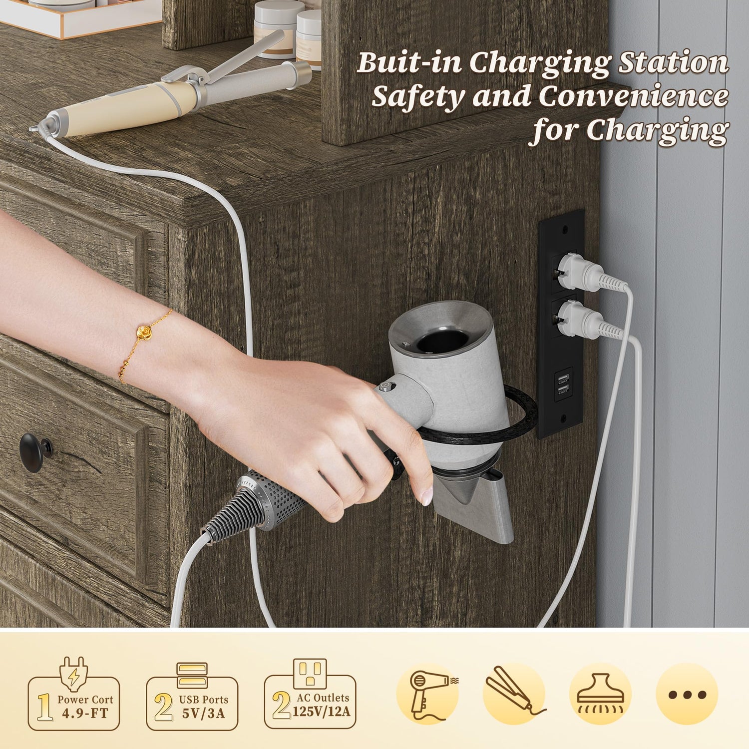 - 【Built-in Charging Station and Hair Dryer Rack】This farmhouse vanity desk includes 2 standard plug sockets and 2 USB ports to allow you to sit at your vanity and use your hair dryer or curling iron within arm reach and charge your phone, tablet, or other electronics. Without moving your position, you could finish your exquisite makeup and hair styling sitting in set of this vanity desk.