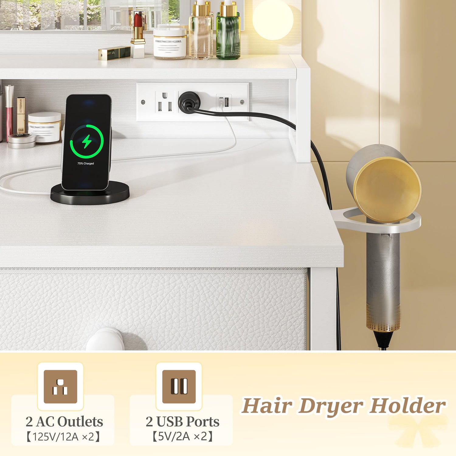 - 【Vanity Desk with Charging Station and Hair Dryer Rack】This white vanity features a power strip and a hair dryer rack,more easy to reach and use. Without moving your position, you could finish your exquisite makeup and hair styling sitting in set of this vanity desk.