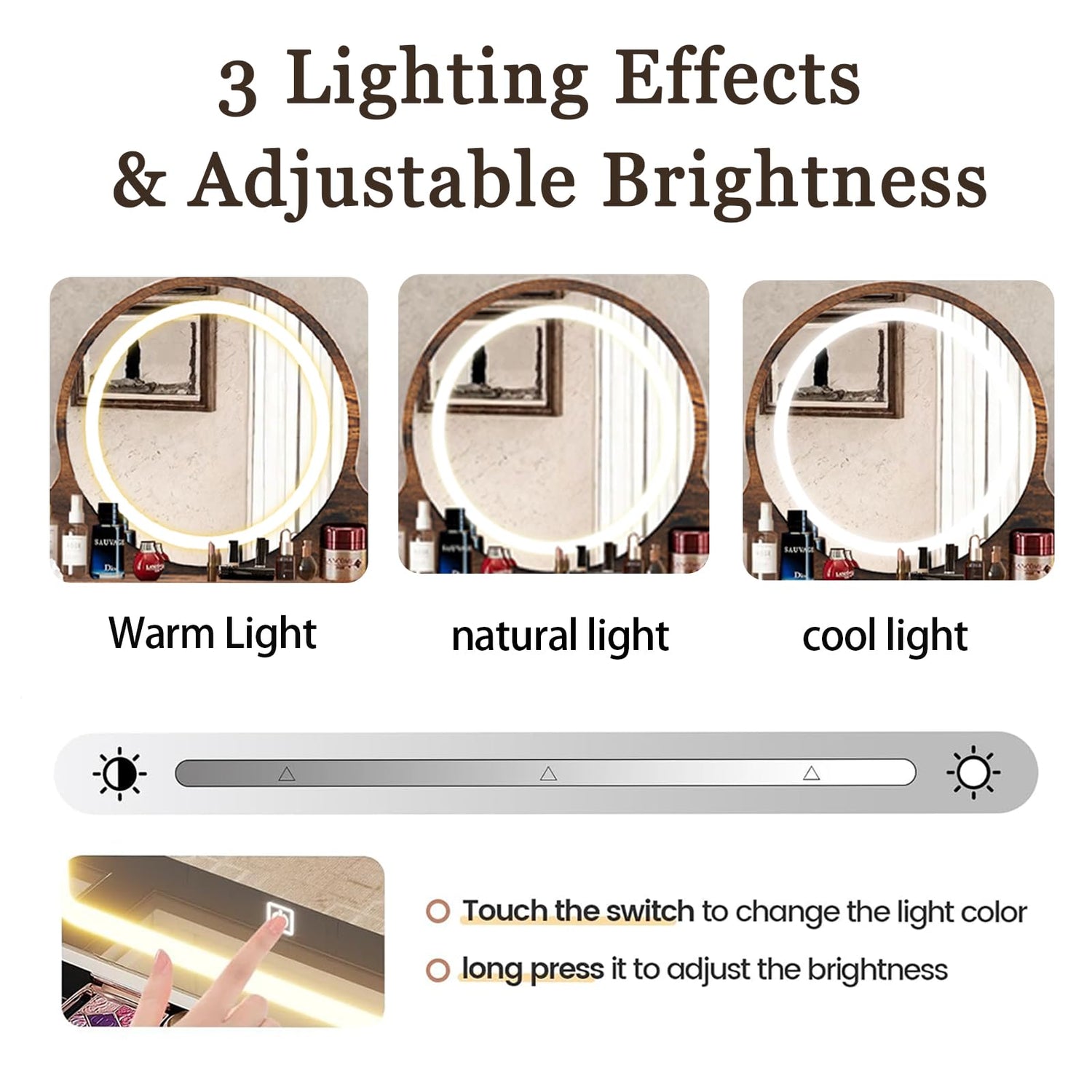 • MAKEUP TABLE WITH BIG MIRROR WITH LIGHTS: Our dressing table has stylish LED lights with 3 different color lighting modes: warm yellow, warm white and cool white. You can easily change the color mode by touching the switch, or adjust the brightness by pressing and holding the switch
