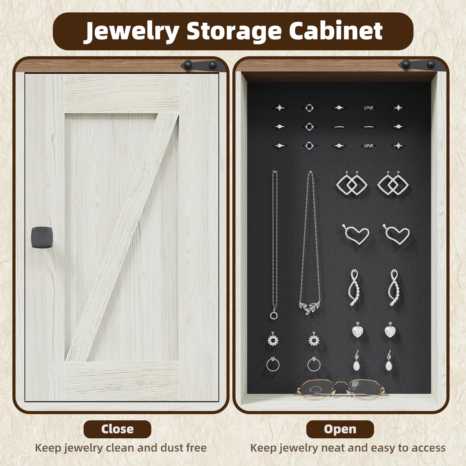- Dedicated Jewelry Organizer: The upper compartment is designed to hold rings and earrings, while the lower section offers hooks to hang bracelets and necklaces. The enclosed cabinet doors minimize dust exposure, ensuring your accessories stay clean and shiny