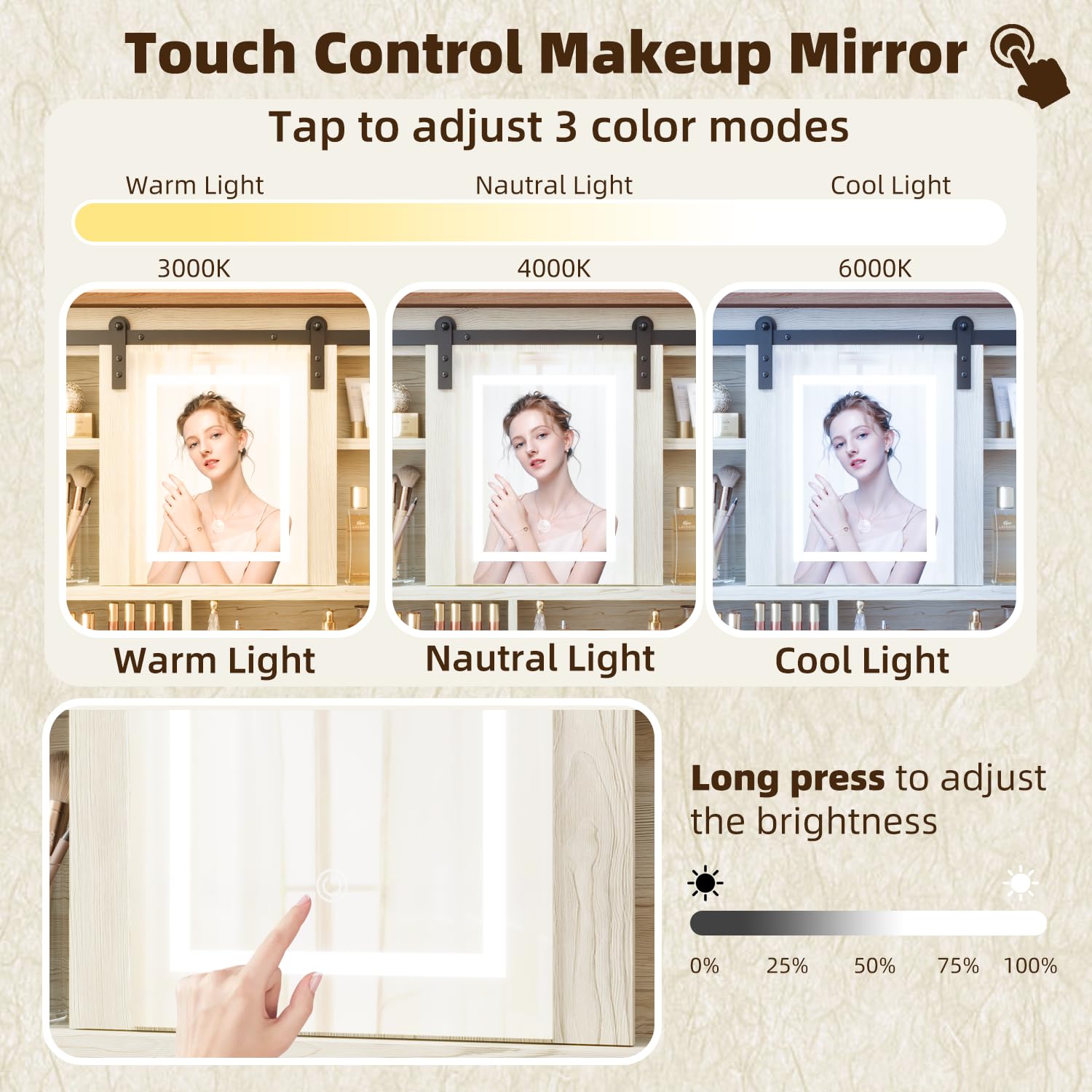 EROMMY 42" Farmhouse Makeup Vanity Desk with Lighted Mirror & Power Strips, Vanity Table with Sliding Barn Door, Open & Hidden Shelves, Drawers, Jewelry Cabinet, White Dressing Table, Light Adjustable
