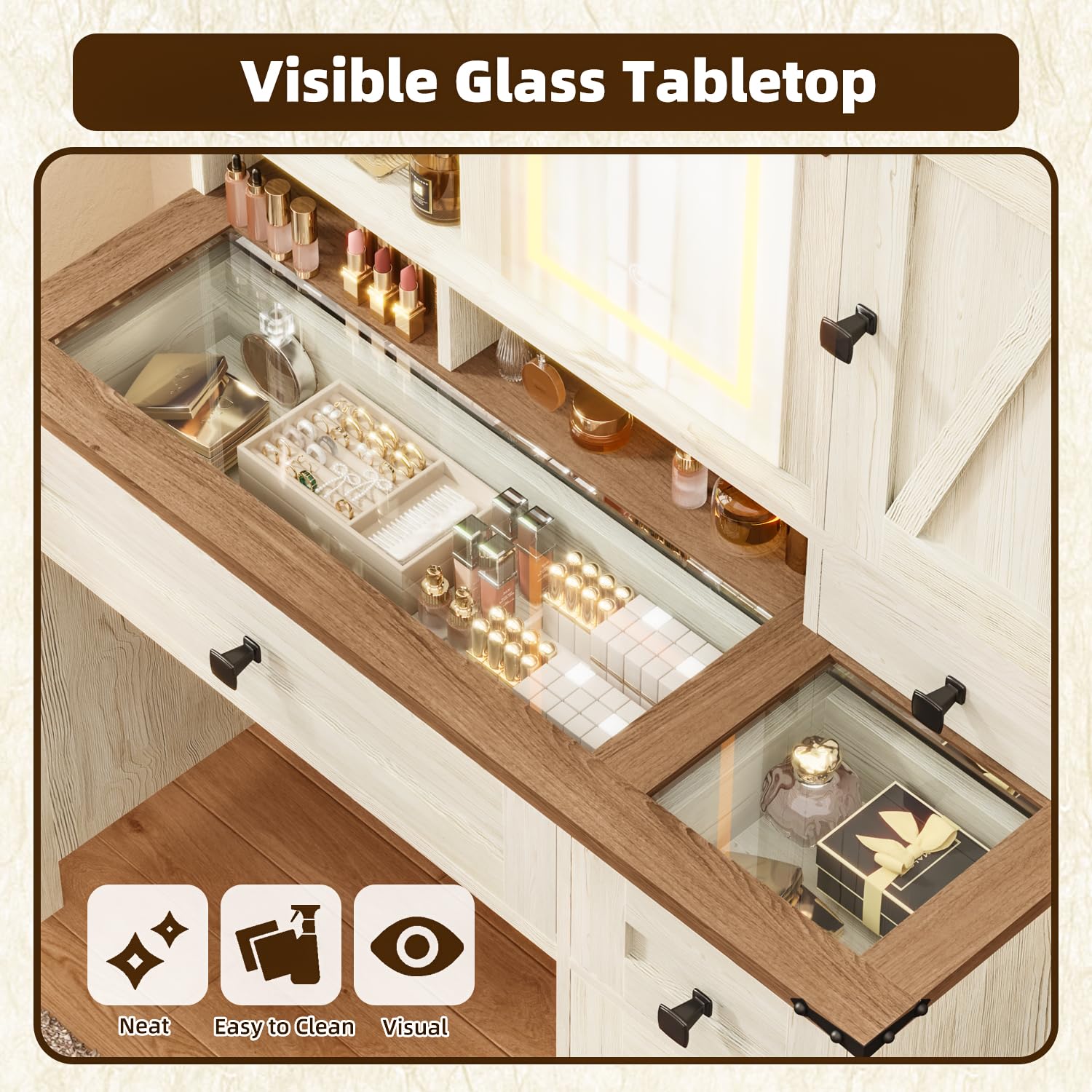 - Farmhouse-Inspired Makeup Vanity Desk with LED Mirror: Elevate your space with the perfect blend of rustic charm and modern functionality. This farmhouse-style makeup vanity features a weathered white finish with a vintage wood grain design. Transparent glass desktops provide clear visibility to easily locate your cosmetics