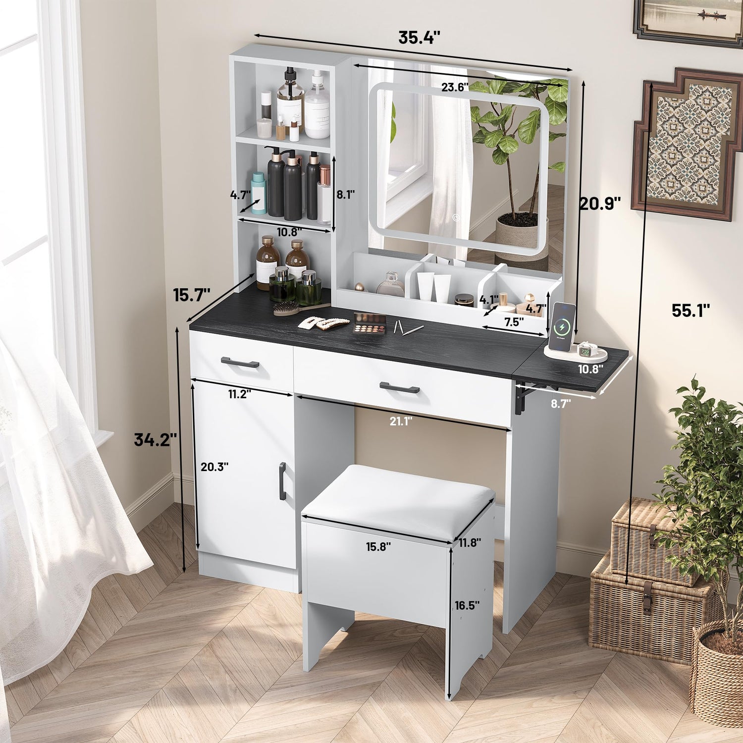 - ☃️【Powerful Storage Capacity】Wider desktop with 2 big drawers , 3 open storage area, 2 RGB cabinet and 1 fold-up panel.This provides ample storage space for your jewelry, hair accessories, and cosmetics, allowing you to keep your desk clutter-free by sorting items according to your preference. Perfect size for bedroom and dressing room: 44.1”(L)*15.7”(W)*55.1”(H) large vanity.