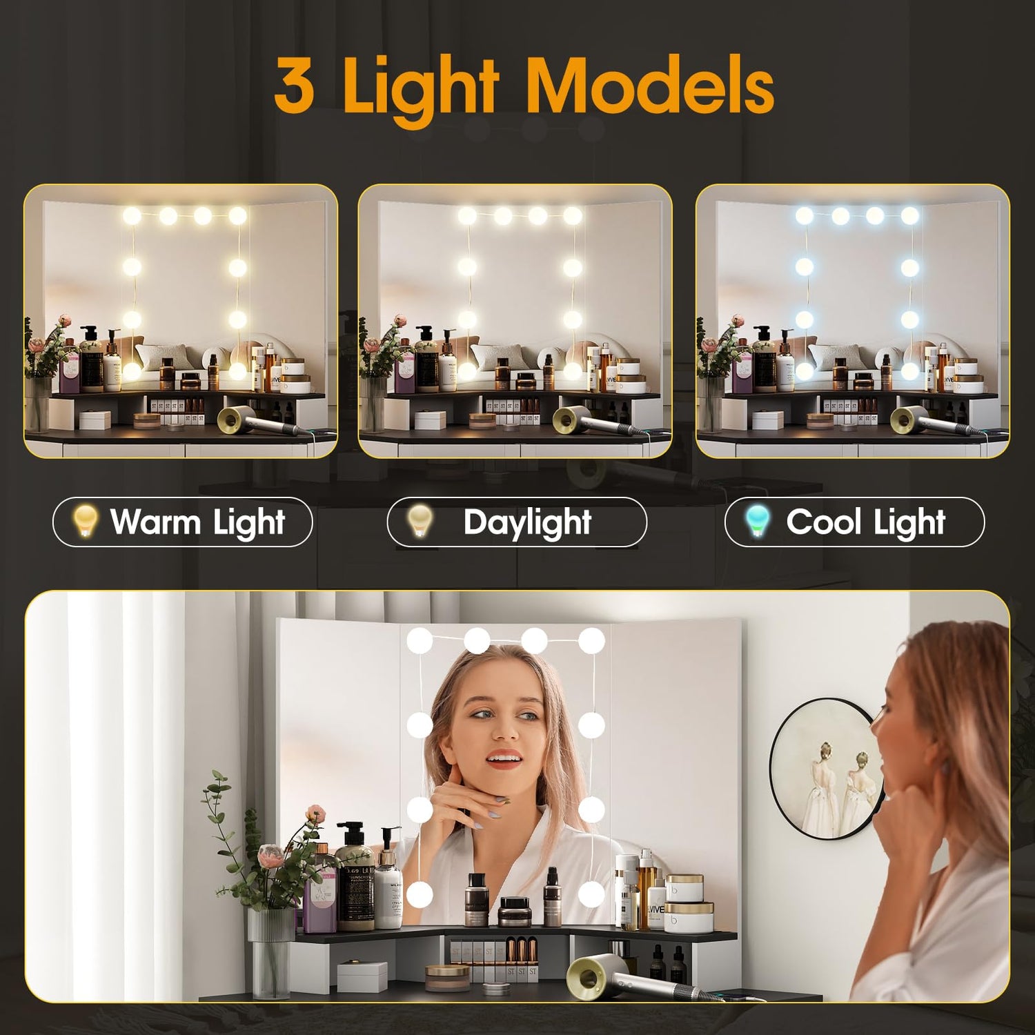 - Adjustable Lights&Large Mirror: Three lighting modes are adjustable: Cold white/Natural/Warm yellow, meet your different light needs, 3 Different angels large mirrors, make it convenient for you to makeup in the morning or hang out in evening