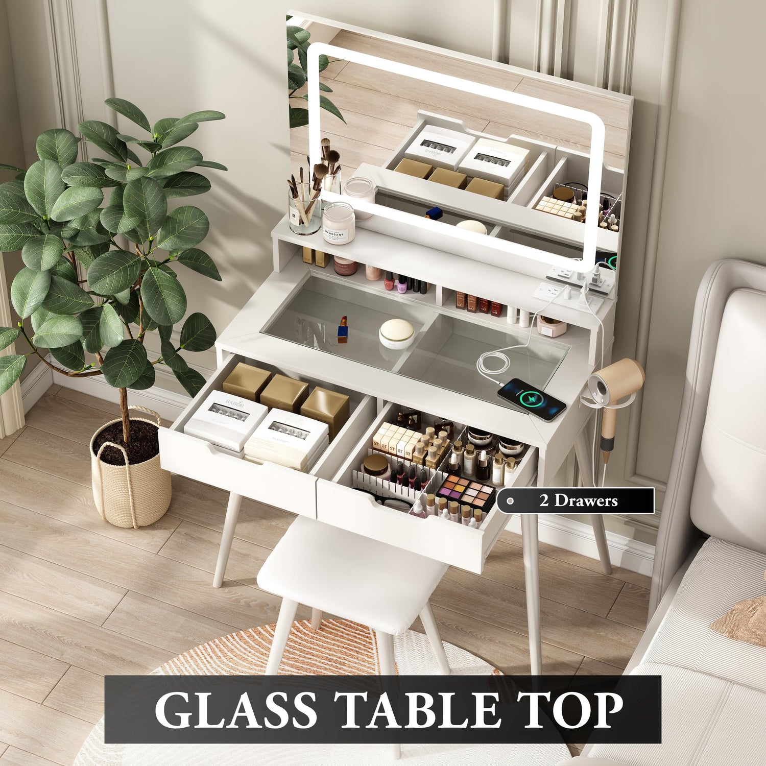 - Multifunctional Small Dresser Set:This vanity desk with Led Lighted Mirror has a wide table top 2 drawers, 1 large under-desk shelf.and the table top is a clear piece of glass that allows you to see the drawers of cosmetics. There is also a storage loft on the table top.Make your room look very neat and elegant