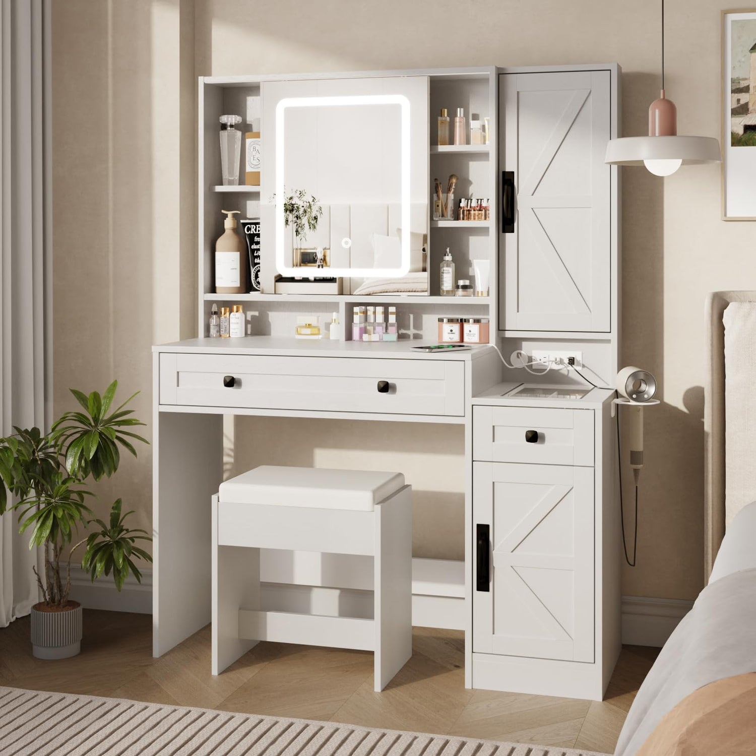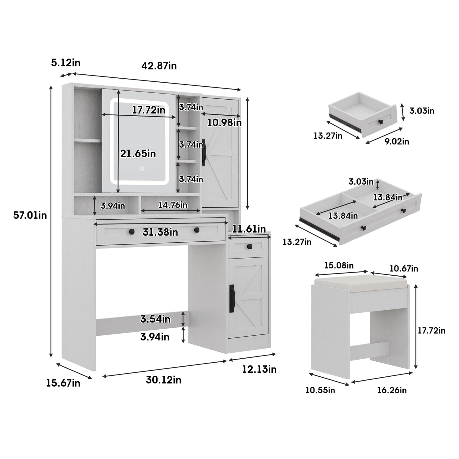 - Powerful Storage Capacity: The vanity mirror with lights desk and chair comes with 2 drawers, 2 side cabinets, and 3 hidden shelves behind the mirror, The white vanity with lighted mirror also comes with glass top drawers, all your cosmetics products can be categorized and neatly stored on your dresser