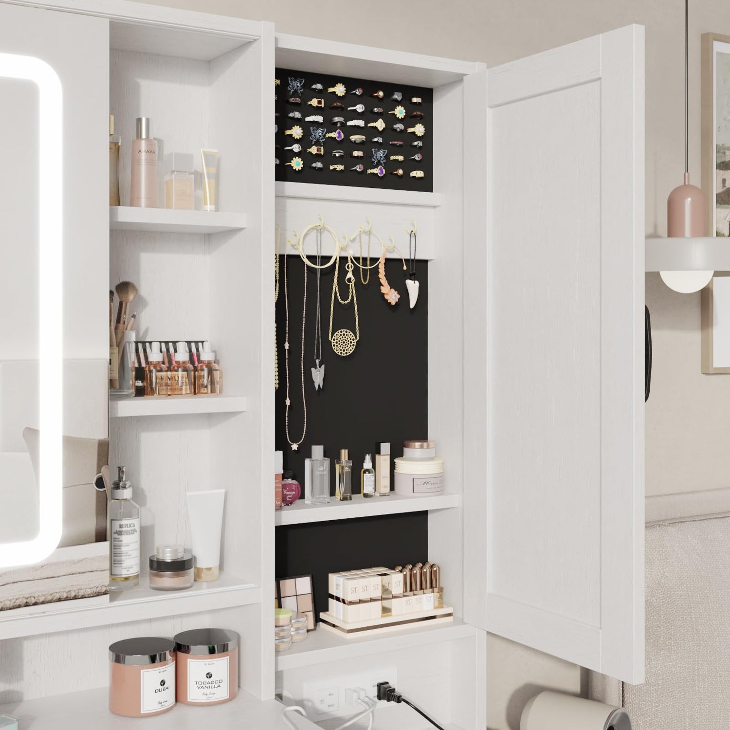Fameill Vanity Desk with Mirror and Lights, Makeup Vanity Desk with Power Outlet, 2 Drawers & Storage, Vanity Table with Chair & Jewelry Cabinet, for Bedroom (White)