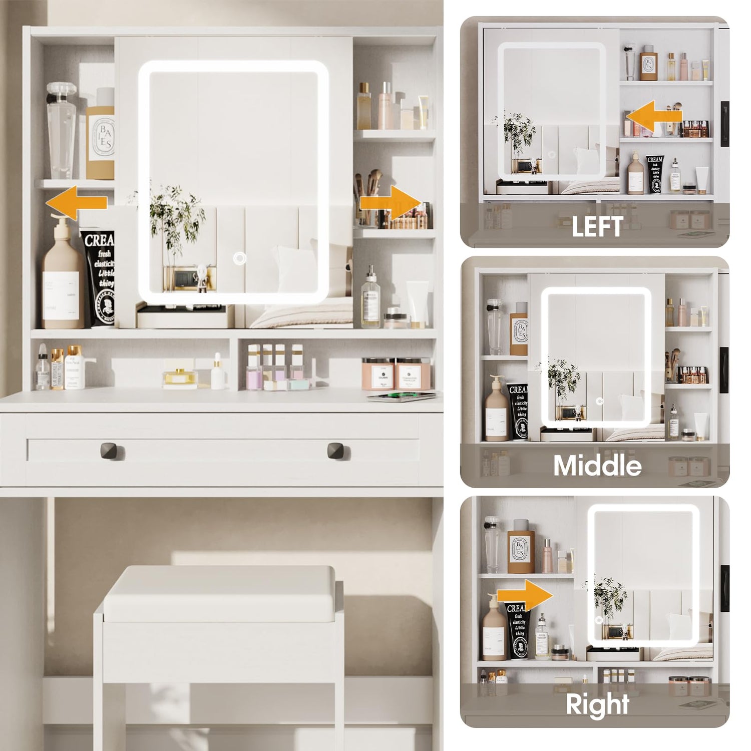 - Slide Touch Control Vanity Mirror: The makeup vanity desk has built-in LED strip lights, you can adjust 3 color modes (Warm Yellow, Natural Light and Bright White) at the touch of a button, provide you with super bright lighting conditions, you can slide the vanity mirror with lights to any side you like