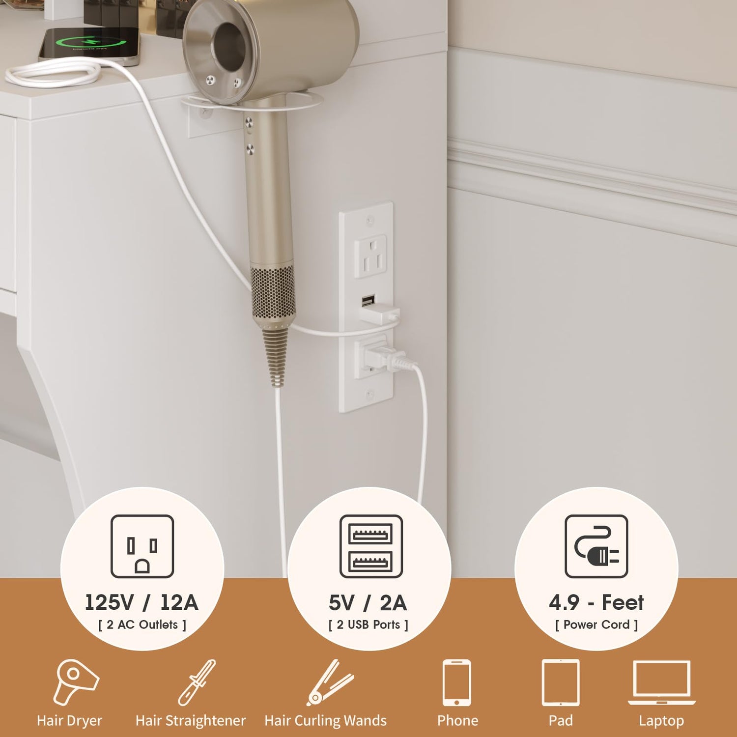 - 【Vanity Table with Charging Station】Our make up vanity adds an upgraded design with 2 standard plug sockets, 2 USB ports and hair dryer holder, allowing you to sit at your cosmetic desk and use your hair dryer or curling iron with the power strip easily. Makeup, hair care, hair styling, phone charging can all be done directly in front of the vanity table, allowing you to take beautiful selfies after applying makeup.