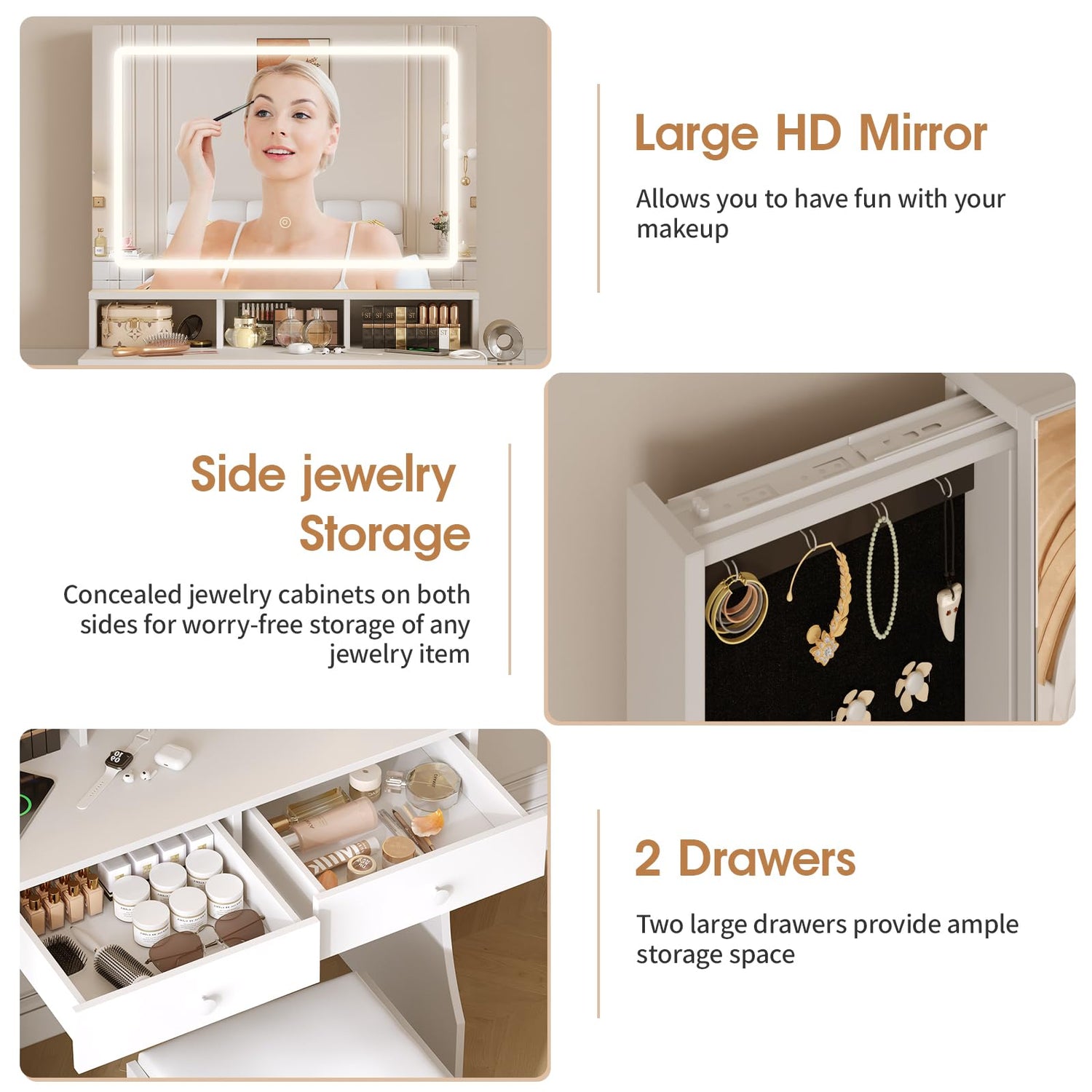 - 【Powerful Storage Capacity】The modern vanity with 2 large drawers and 2 hidden sliding wall-mounted jewelry, this dresser offers an abundance of space to neatly store your makeup and accessories. The 3 storage compartments on the tabletop are great for organizing your lipsticks, skincare products, makeup bags, etc, making the tabletop look very neat and clean.