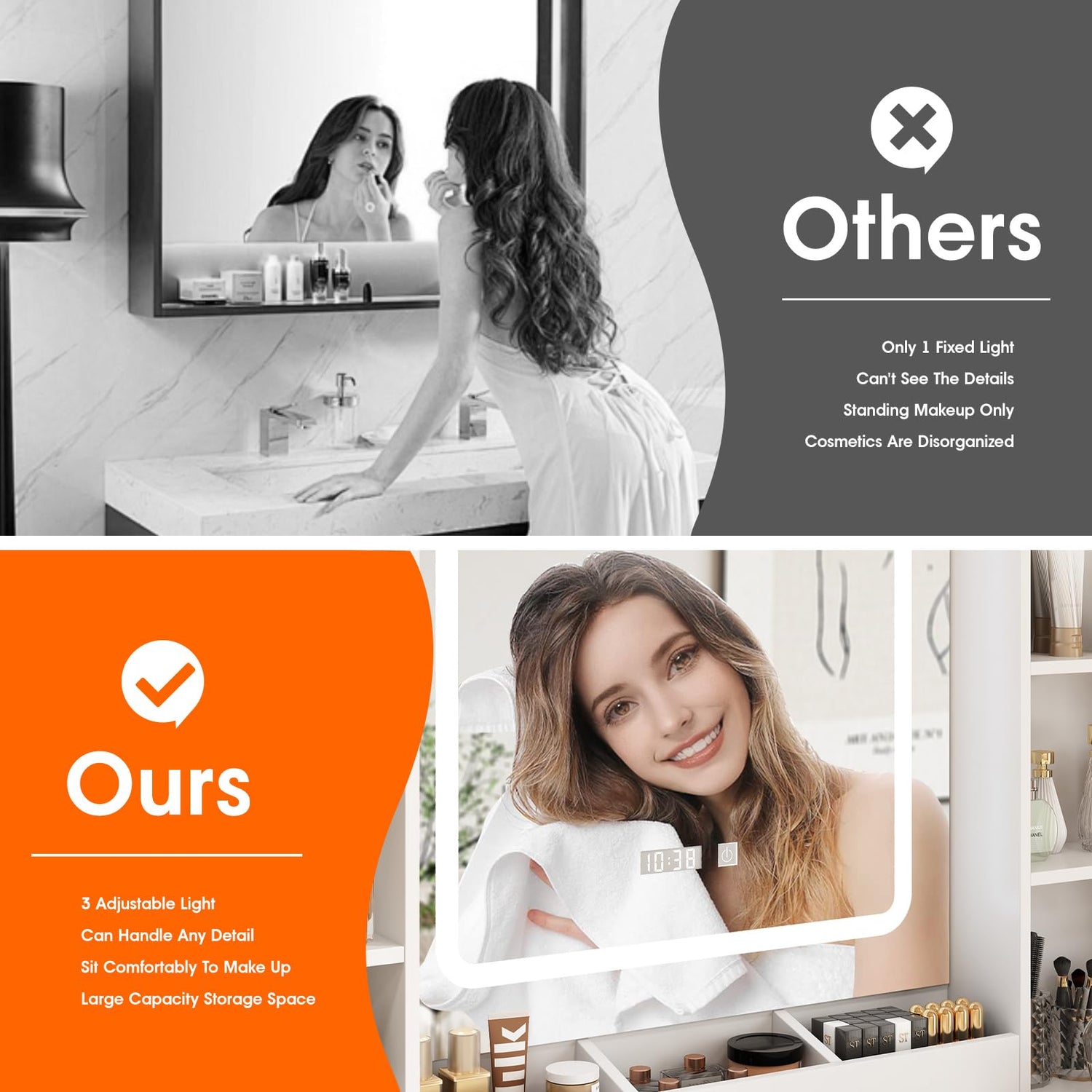 Fameill Vanity Mirror with Lights, Makeup Vanity Desk and Chair, White Vanity Table with Large Storage Drawers and Shelves, Time and Temperature Display, 3 LED Lighting Modes Adjustable
