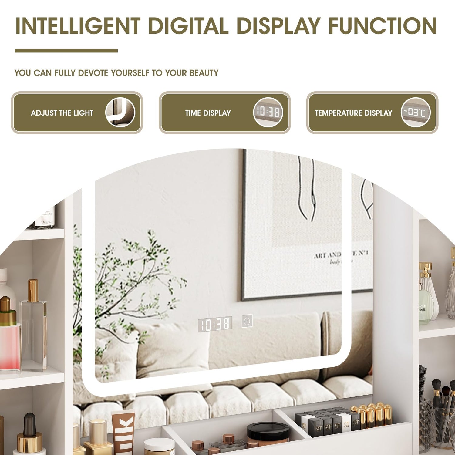 - UNIQUE DISPLAY FUNCTION: This white vanity with LED mirror features time and temperature display. The time helps you makeup without looking at your electronic devices frequently. And the temperature helps you to make a quick decision for today's outfit