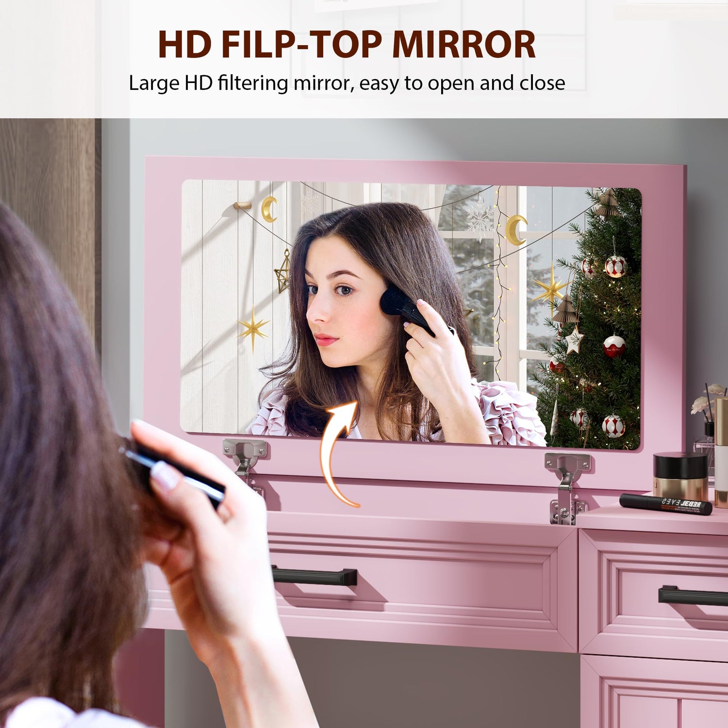 - Makeup Table with Large HD Mirror: A flip-up mirror (28.66"W * 15.75"D), much larger than a typical vanity mirror. The mirror's large surface can clearly reflect your entire face, which is handy for applying make-up