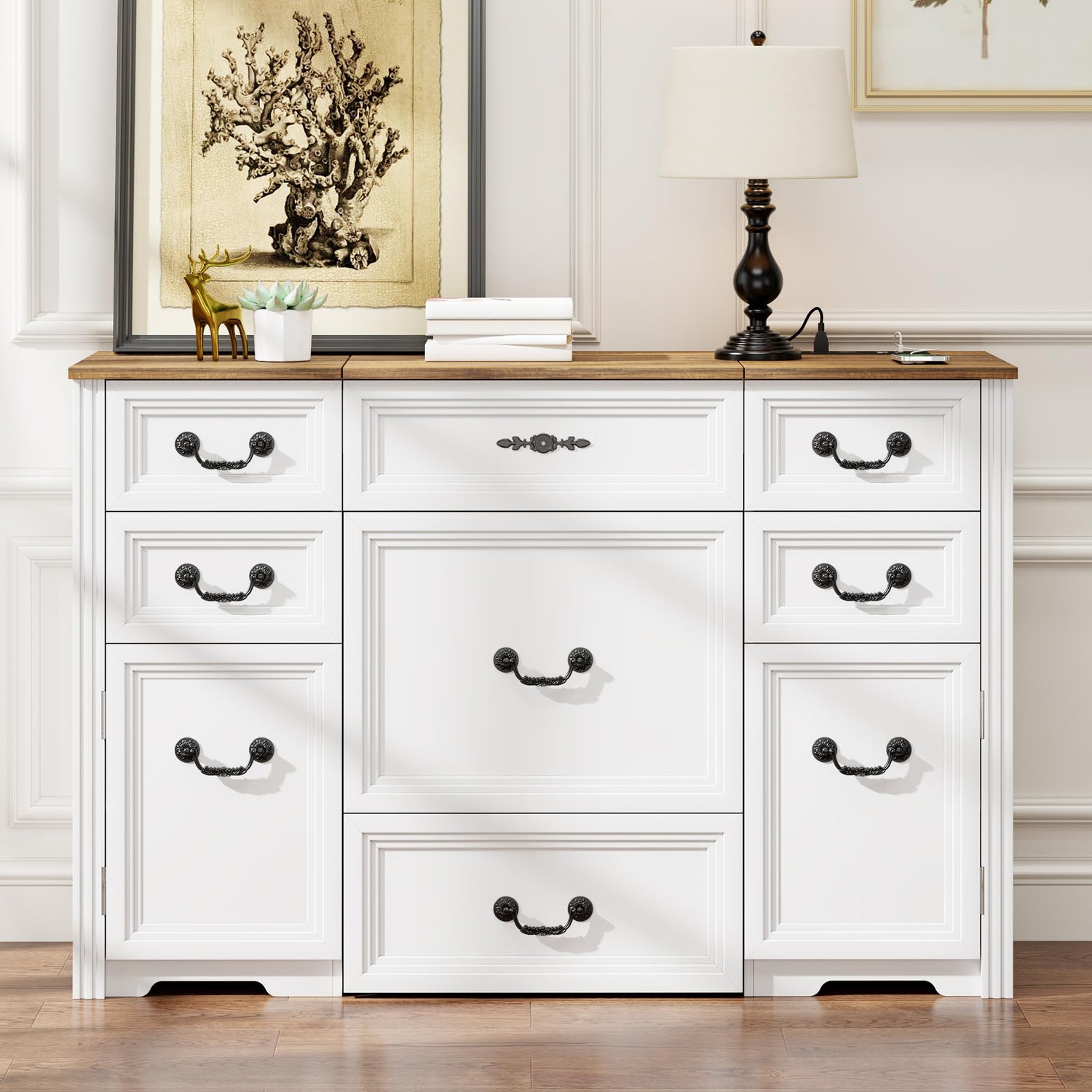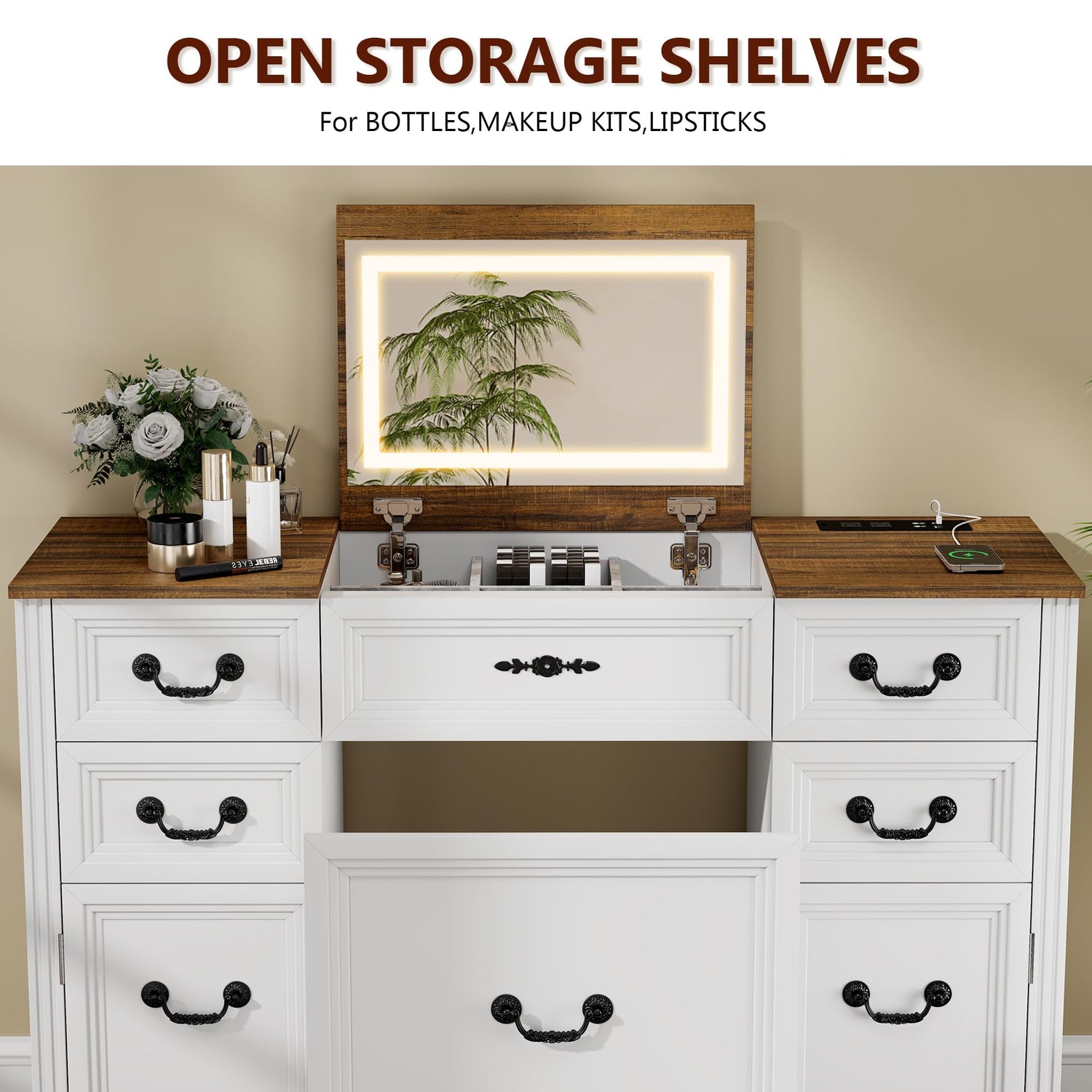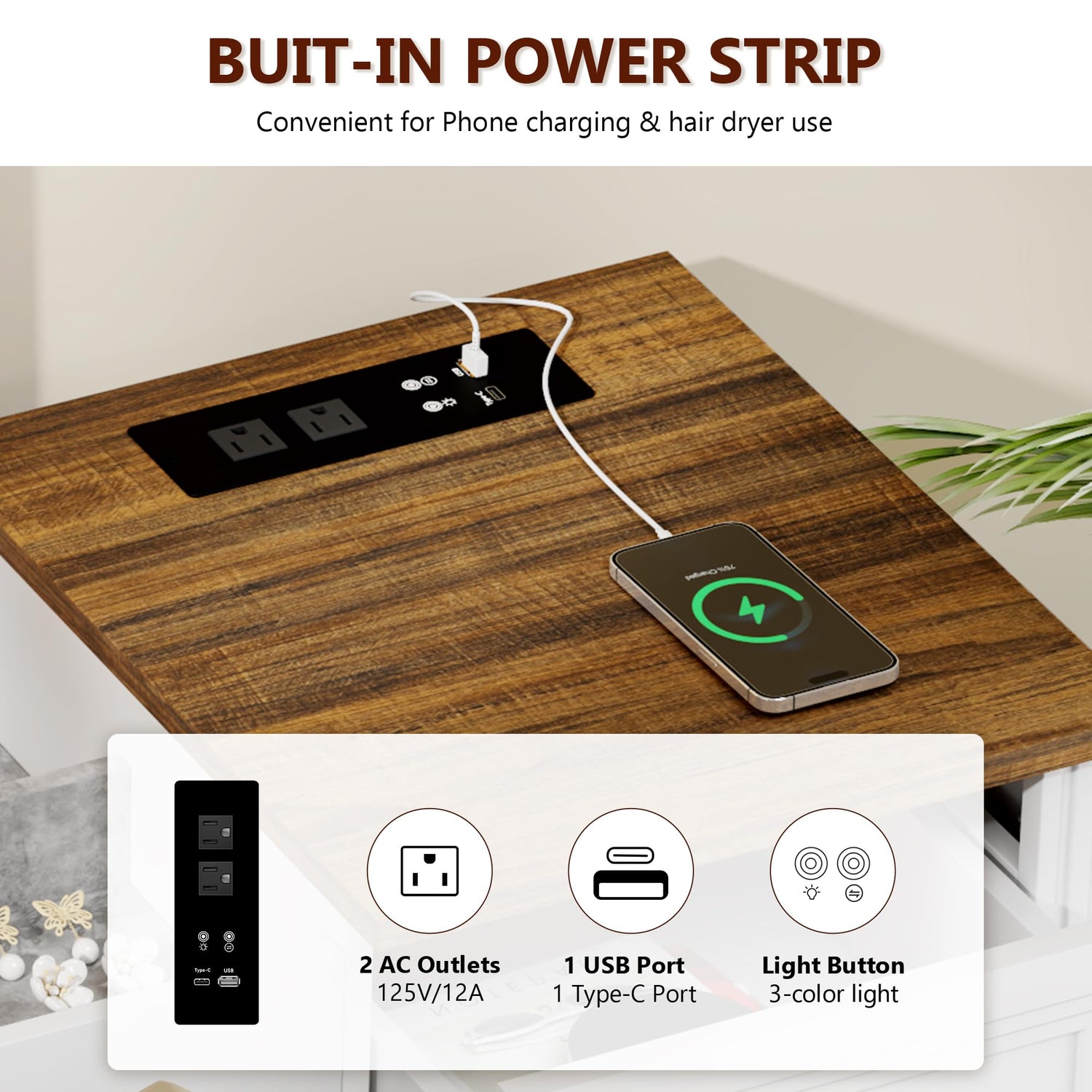 Features: Convertible hidden mirror that folds away when not in use. Integrated LED lights with adjustable brightness for makeup application. 6 large drawers to store beauty products, accessories, and essentials. USB charging ports and power outlets for easy device charging. Durable black or white wood finish that complements any modern decor.