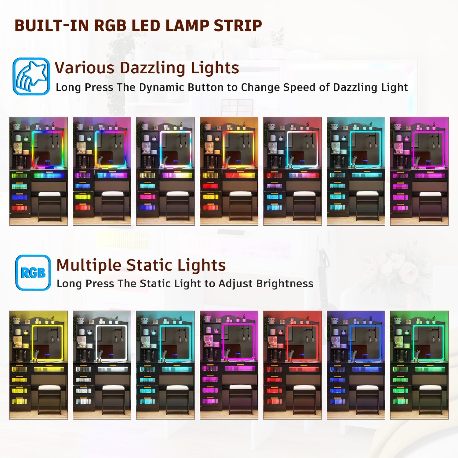 - 🌈【Countless Dazzling Lights】The vanity table has countless variable lights, which can be dazzling or RGB monochromatic; Long press the RGB static light button to adjust the brightness; Long press the dynamic light button to adjust the speed of the transformation. Provide richer colors for your life.