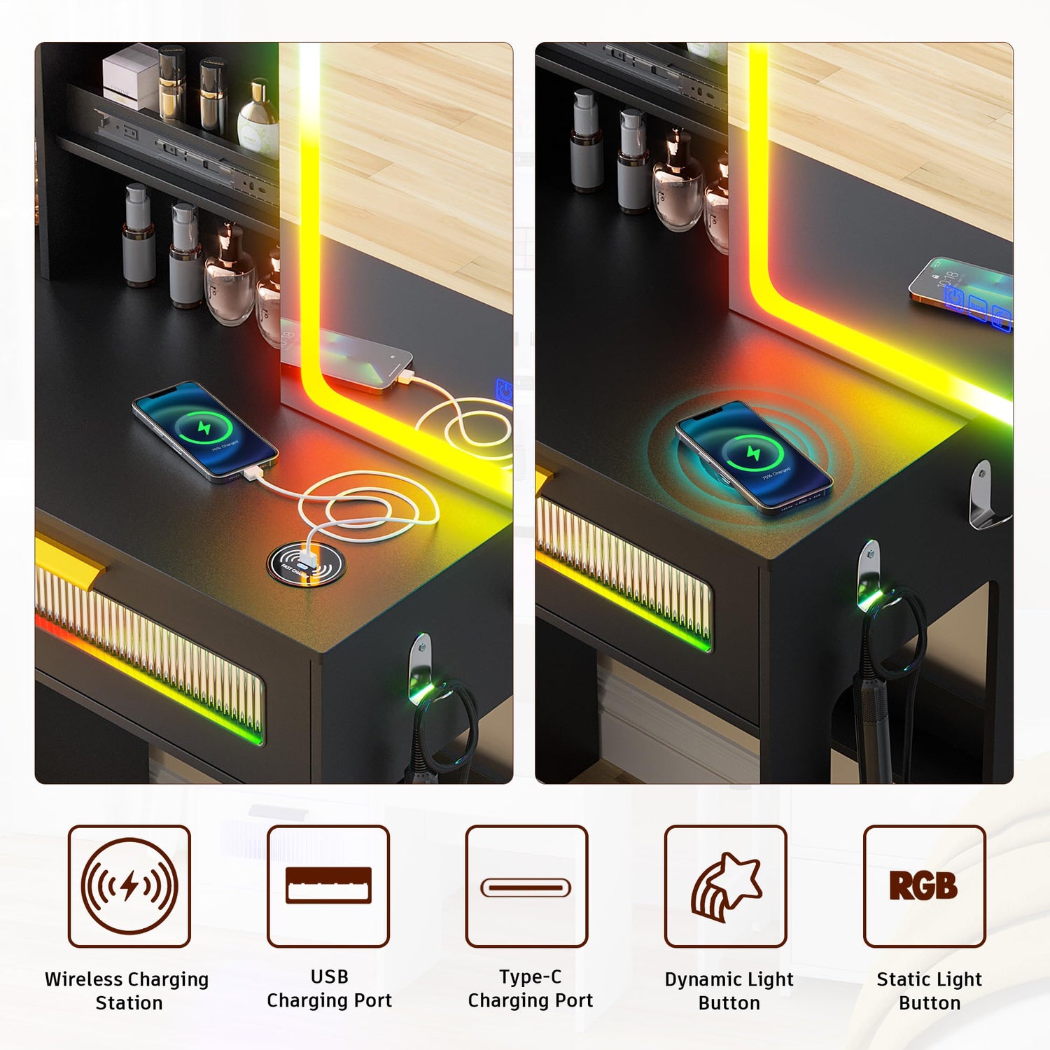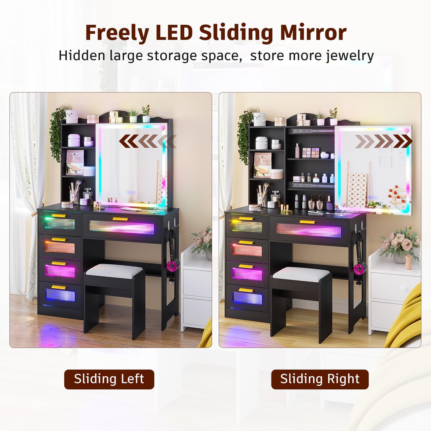 FOMNEY RGB LED Vanity Desk with Mirror and Lights, Makeup Vanity Desk with 3-in-1 Charging Station, Vanity Set with Stools&Sliding Mirror, Make UP Table with 5 Drawers (Black)