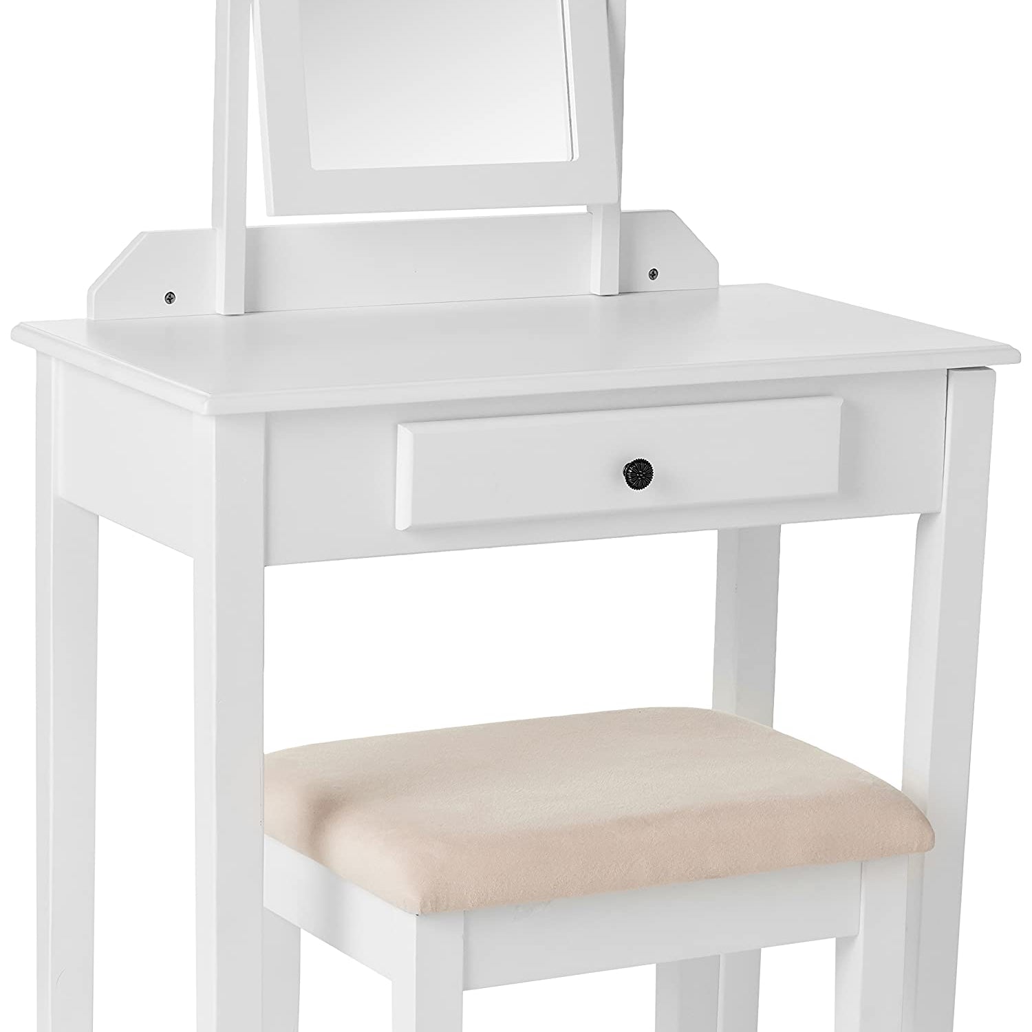Details: Enhance the look of your decor with the Vanity Set with Mirror. This set is constructed from wood and is sturdy and durable. It is available in multiple finishes and you can choose the one that best suits your home's interiors. The contemporary set includes a vanity, a mirror, and a bench. The vanity has a spacious drawer that can accommodate your required vanity essentials and jewelry. The round knob of the drawer gives makes for a firm grip that facilitates easy and smooth functionality. It has an upholstered bench that provides exceptional comfort when you rest on it. This Vanity Set with Mirror can be easily cleaned with a damp, soft cloth.