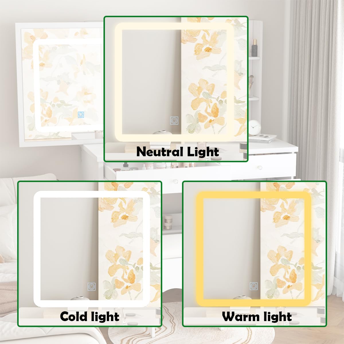 - [Adjustable Color & Britness] - The lighted mirror comes with 3 different light colors settings: warm yellow, warm white and cold white. Esay to adjust the light with touchable button on the mirror. Short press to adjust the light color, and long press to adjust the brightness