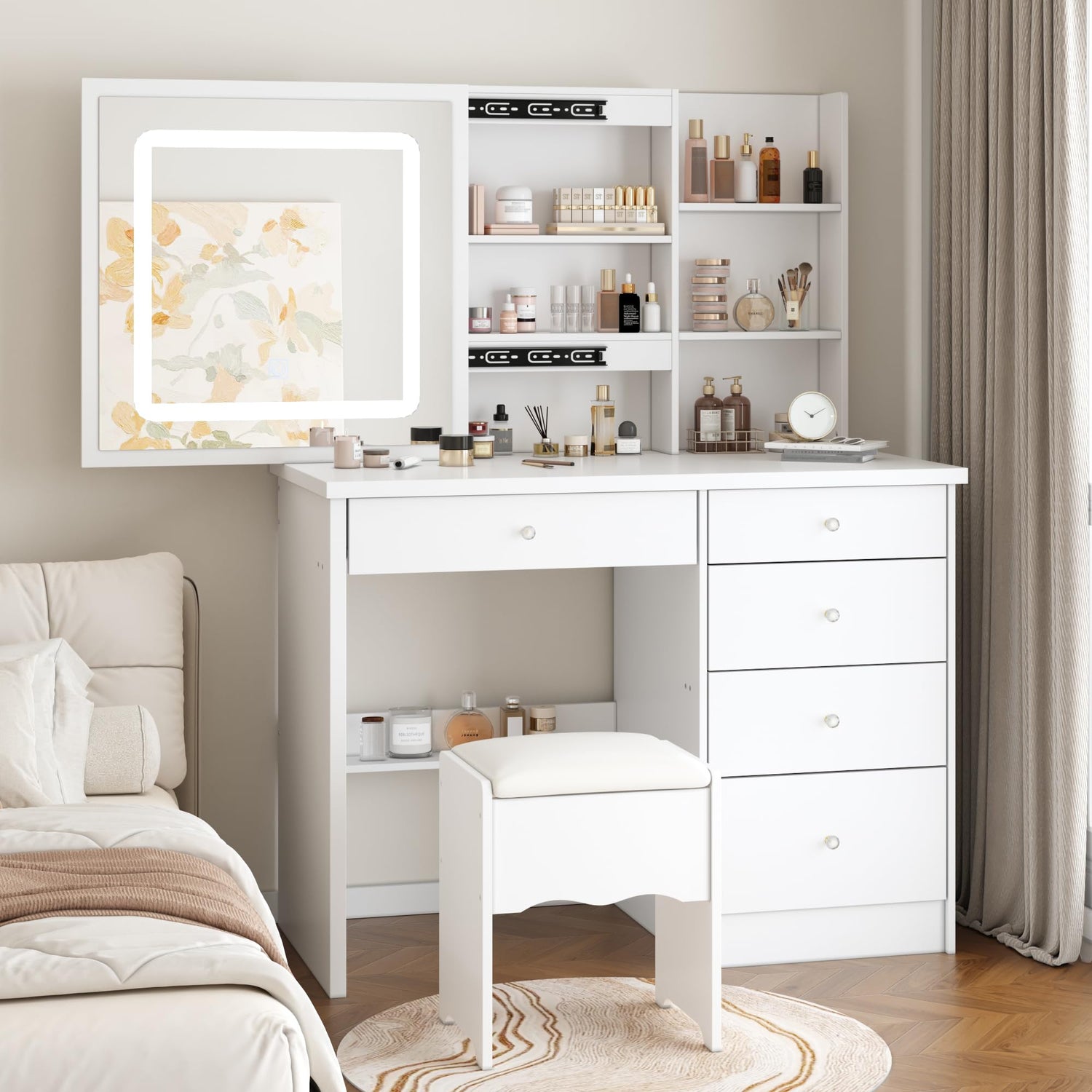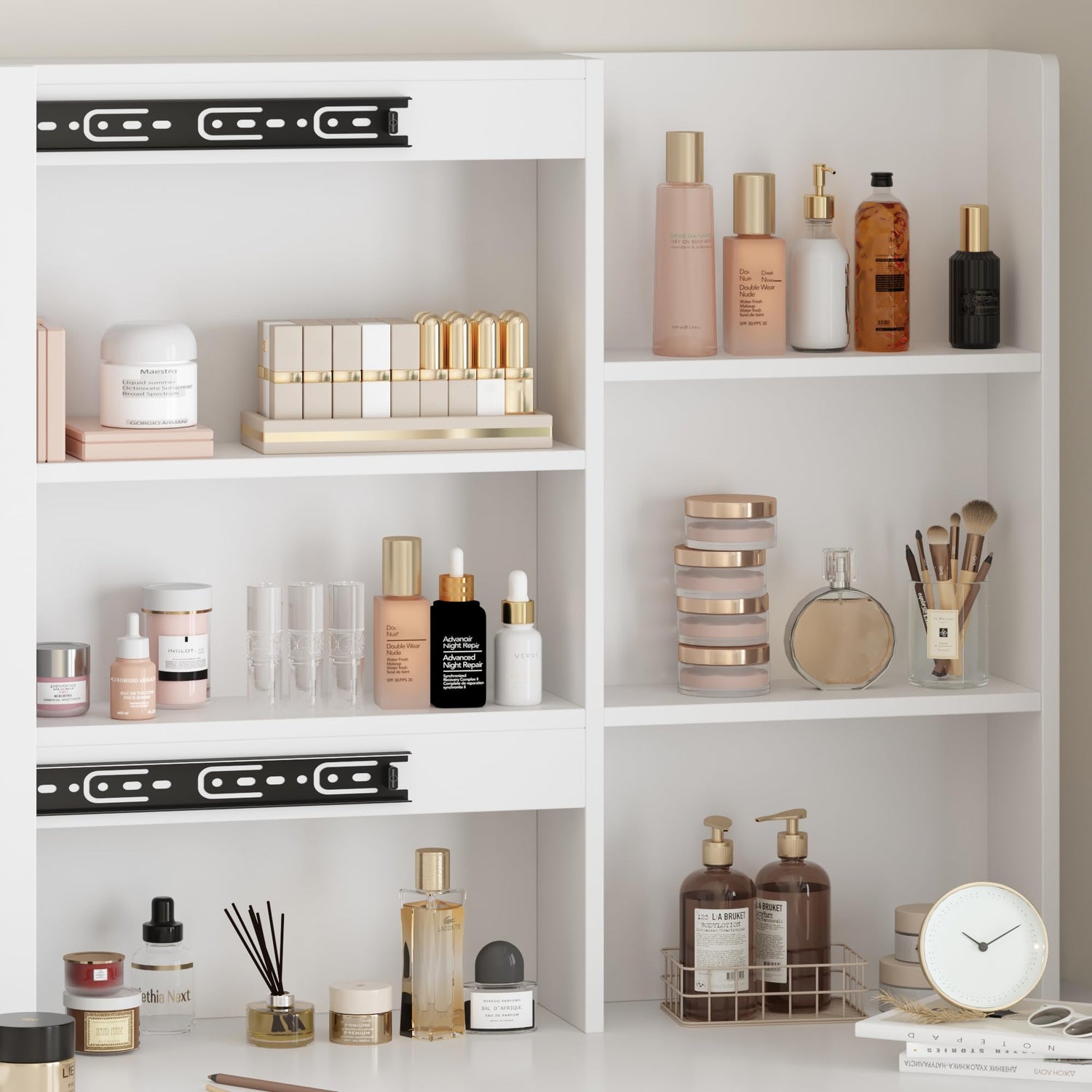 - [Sliding Mirror & Ample Storage] - This vanity desk features 5 drawers, 3-tier open shelf on desktop and 1 tier shelf in leg room. It also contains additional 3-tier hidden shelves behind the sliding mirror, can provide sufficient space to store your various cosmetics and decors