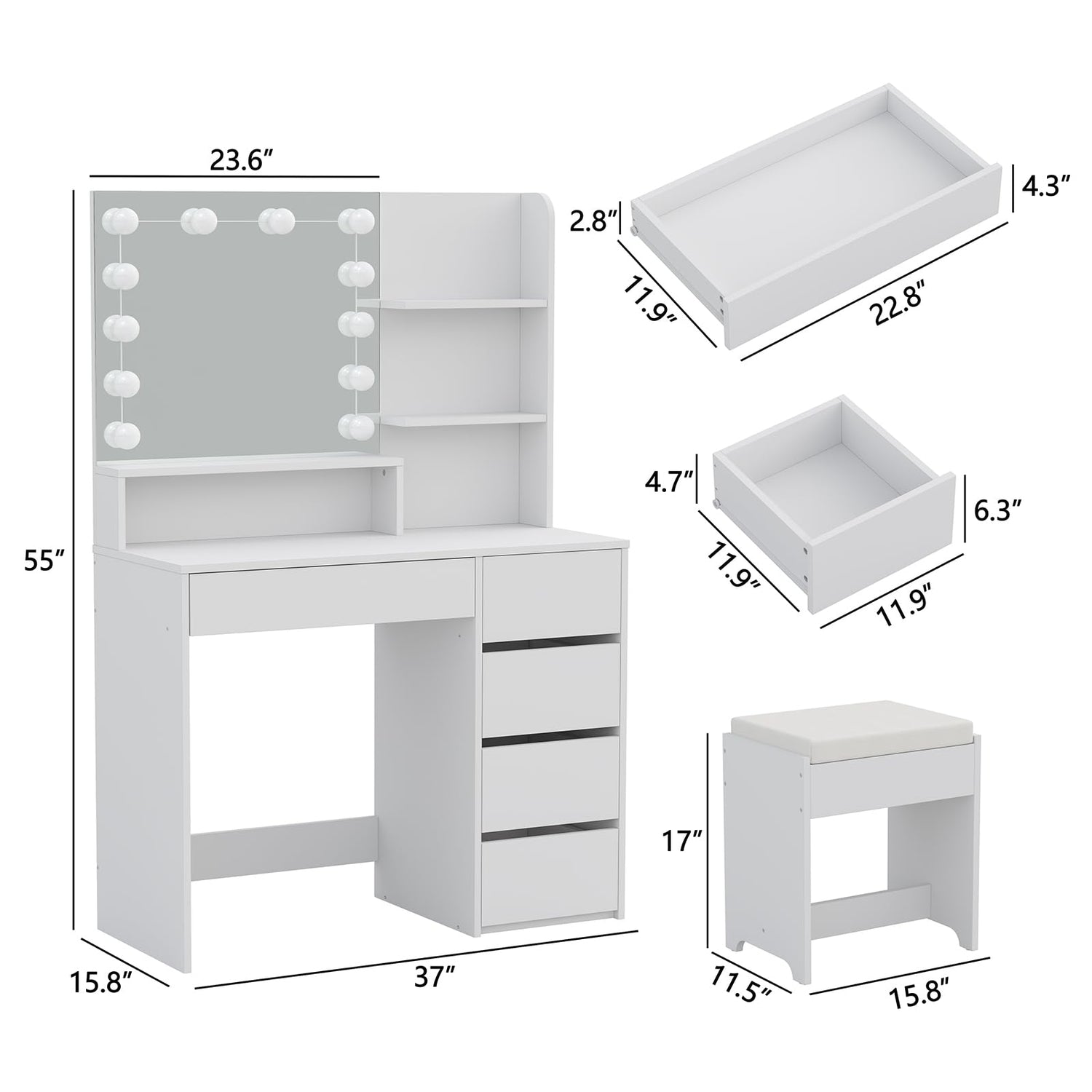 Furniouse 37" W Vanity Desk, Vanity Mirror with Lights and Table Set with 5 Drawers, Vanity Set 3 Lighting Modes Brightness Adjustable for Bedroom Studio