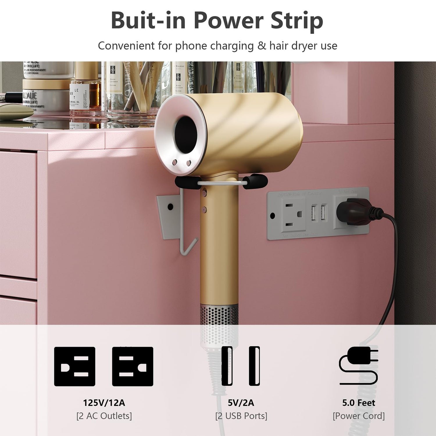 - Built-in Charging Station: The vanity comes with a hair dryer stand with a built-in power outlet; The built-in charging station includes 2 standard plug sockets and 2 USB ports to connect your hair dryer, curling iron, computer, cell phone, ipad and other devices, so that all activities can be carried out on this vanity table