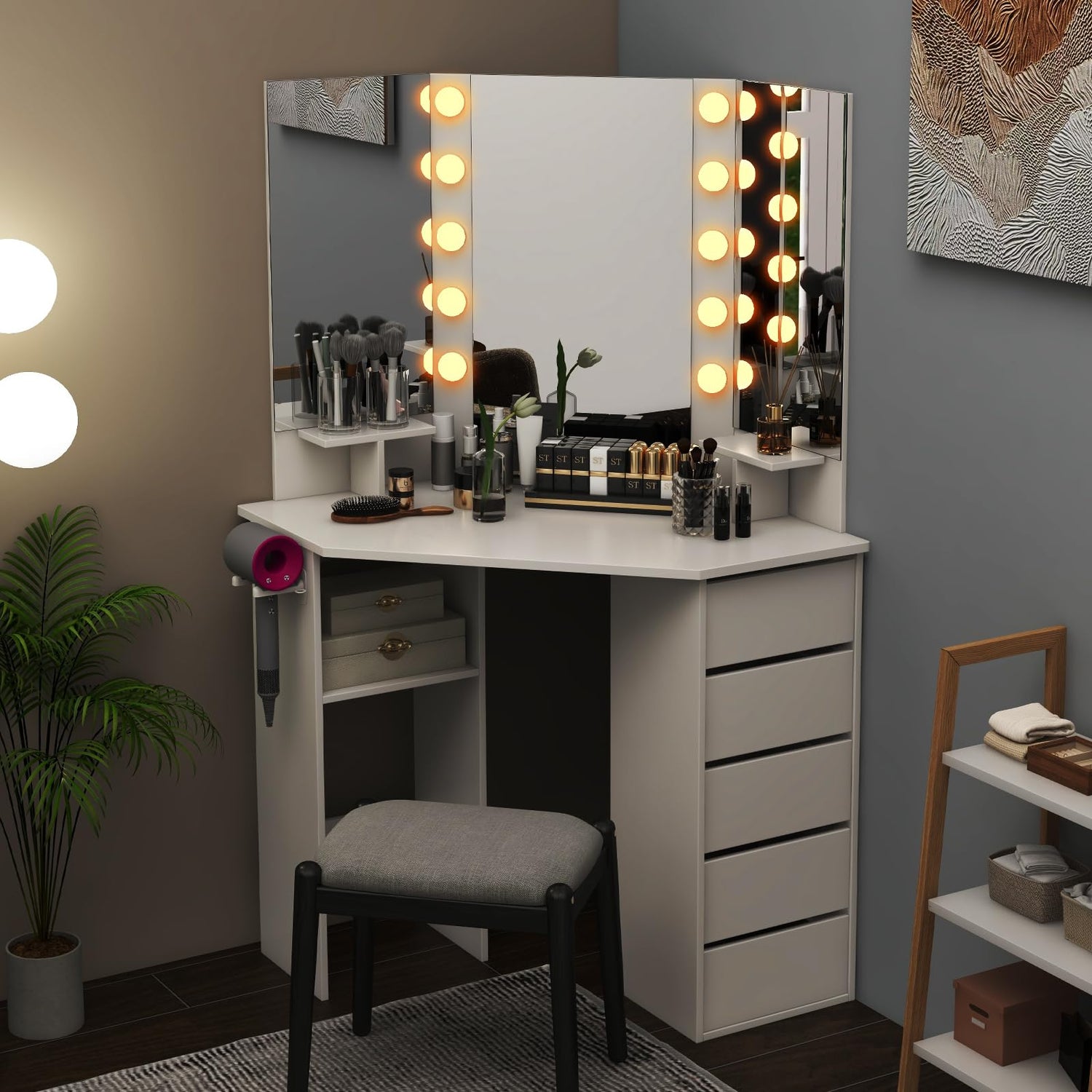 GOFLAME Corner Vanity with Mirror and Lights, Compact Vanity Table with Charging Station, 3 Lighting Modes, 5 Drawers, Dressing Table, Modern Makeup Vanity Desk with Triple Mirror for Bedroom (White)