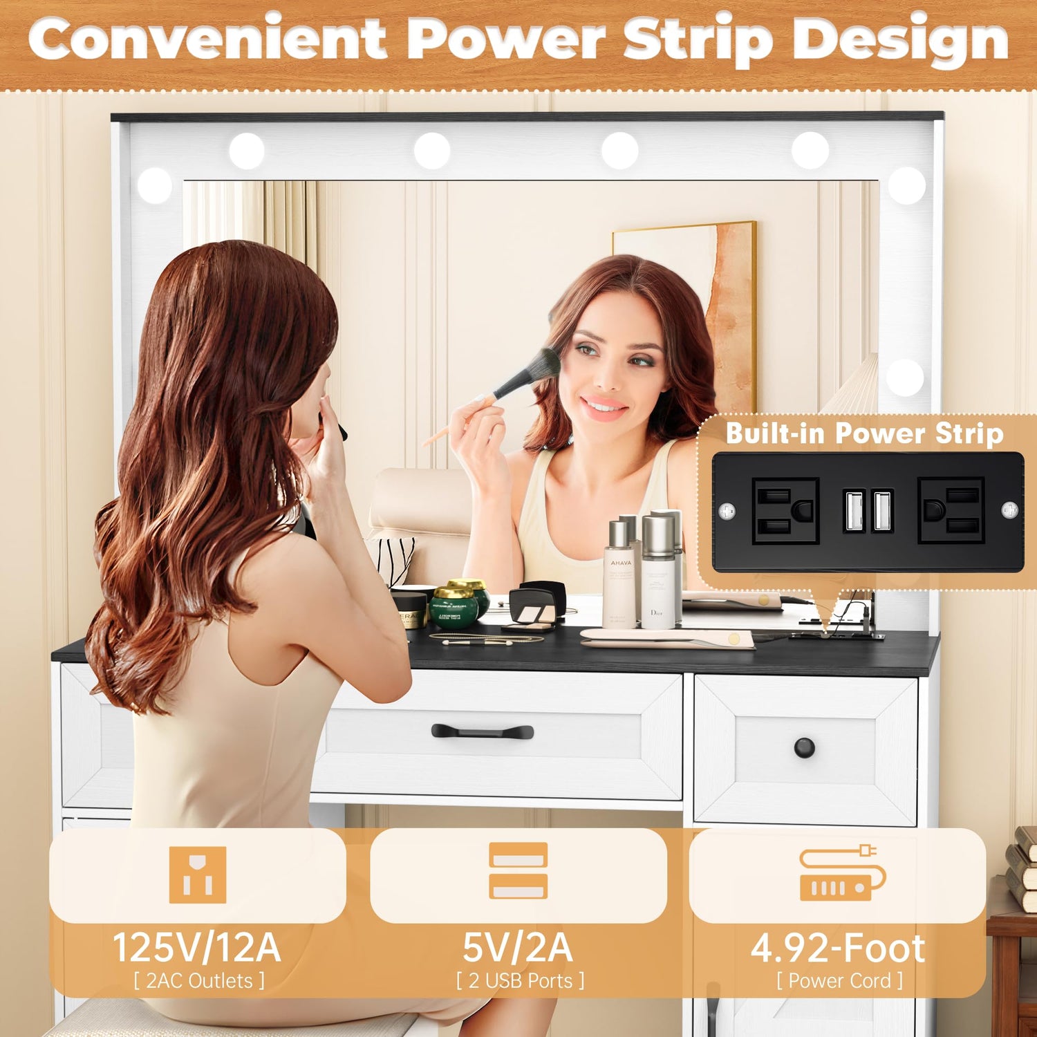 - [Humanized Design] Greenvelly farmhouse vanity desk with mirror and lights is full of humanized design both inside and outside.Inside,we have equipped the drawer with a silencing slide, as well as 10 silencing stickers you could choose to attach.Outside, we are equipped with power strip,it has two sockets, the specification is 125V/12A, and two USB output ports, the specification is 5V/2A ,that you could charge phone and use appliances like hair dryers and fans.