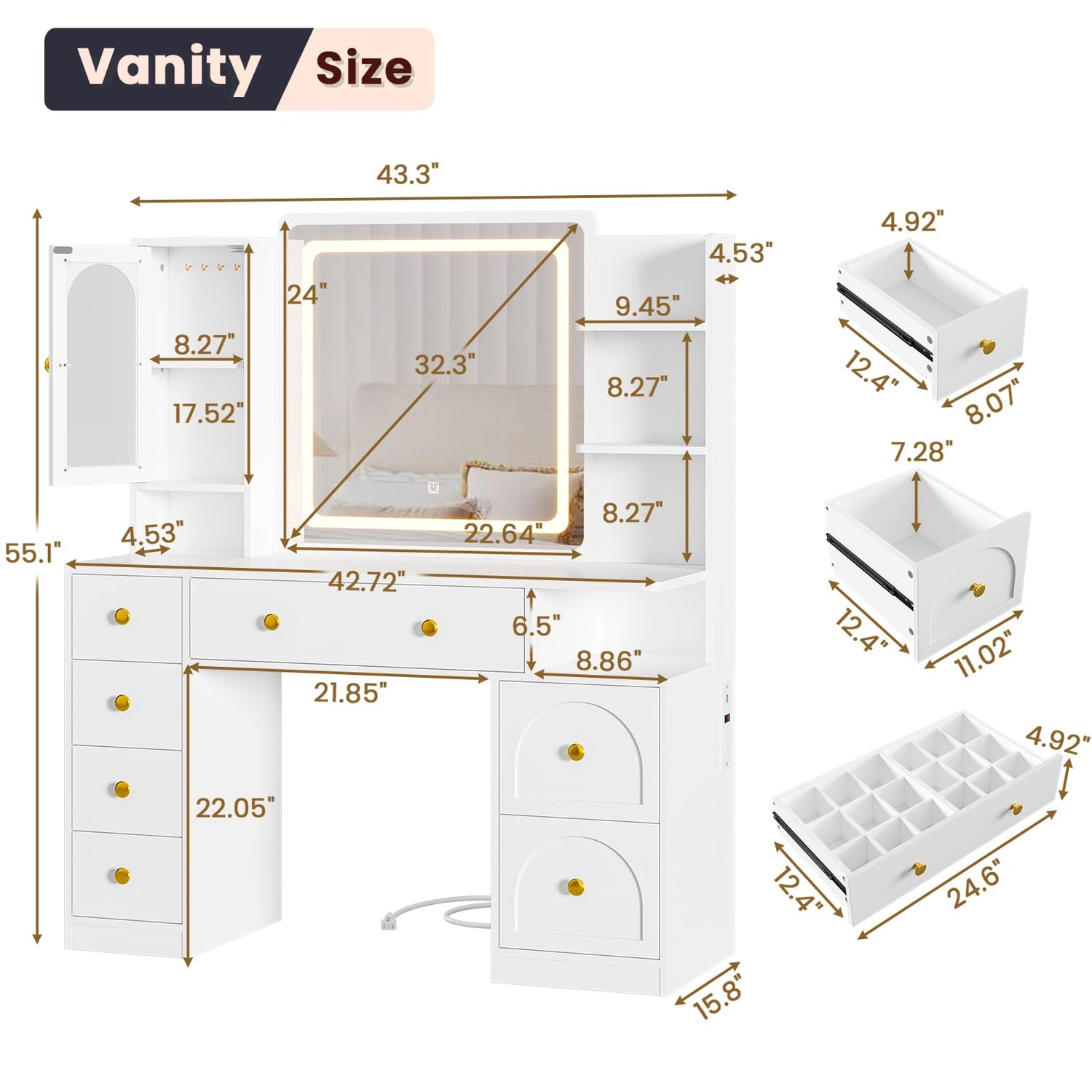 - 【Powerful Storage Capacity】This large makeup vanity comes with 7 drawers and 1 cabinet, allowing you to efficiently organize and store cosmetics, hair tools, and personal items. In addition to the open shelves, we have extended the desktop to provide you with more makeup space, and the space below is convenient for you to temporarily place hair dryers, mobile phones and other charging items. The combination of multiple storage functions helps keep your room organized.