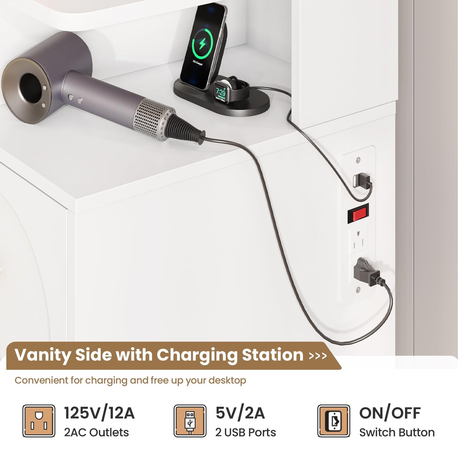 - 【Makeup Table with Charging Station】No more worried about charging. This vanity side with charging station is equipped with 2 standard plug sockets, 2 USB ports and a safety switch, allowing you to use your hair dryer or curling iron more conveniently while applying make-up, as well as charging your cell phone, tablet, or other electronic devices. In this space that belongs to you, relax and listen to music, watch tutorials and share a photo or video.