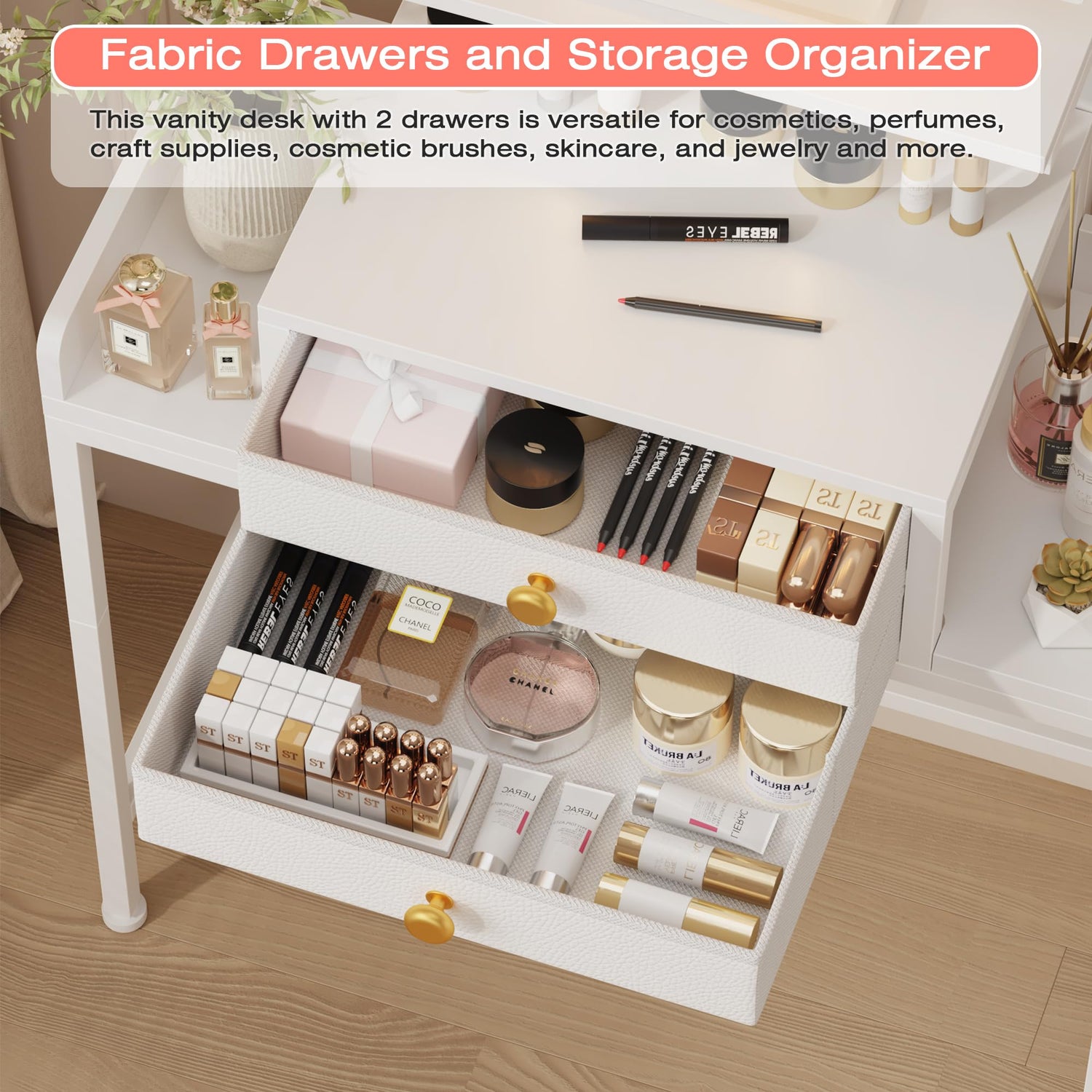 - 【2 Roomy Drawers】The vanity desk comes with 2 fabric drawers, giving you plenty of space to stash your makeup, skincare, and daily must-haves. Keep your desktop clutter-free and your beauty essentials within easy reach