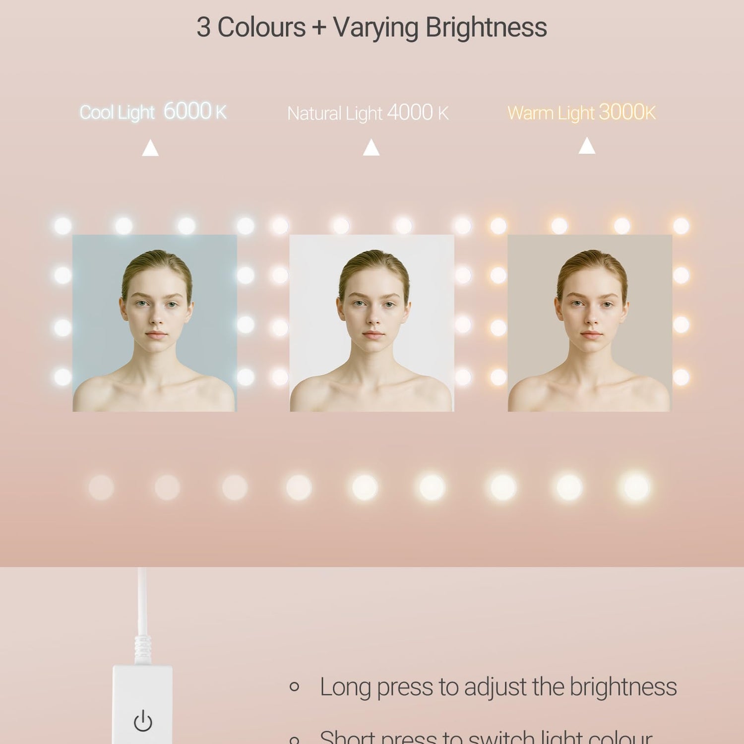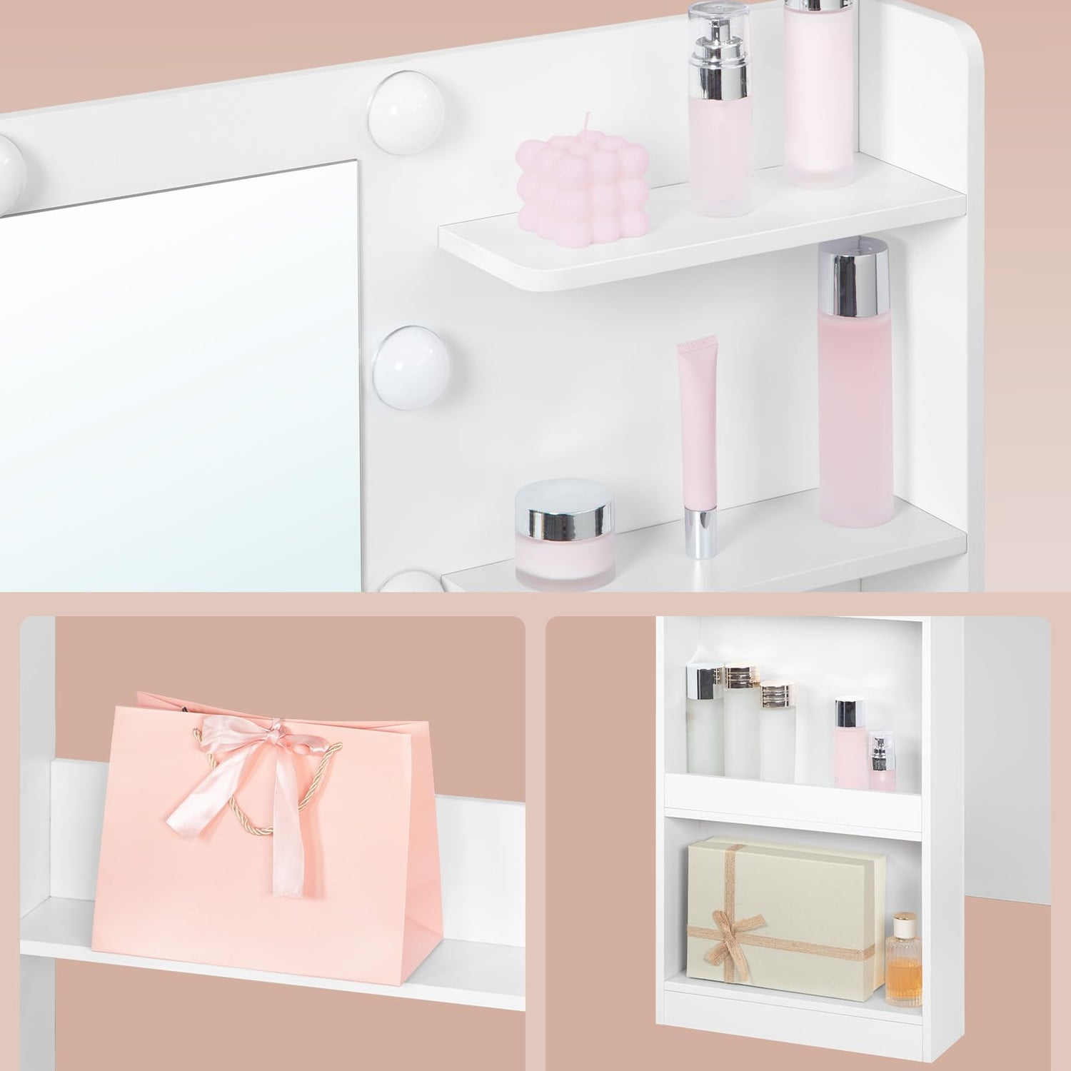 - [Adjustable LED Light] This large vanity desk features an adjustable LED light that reflects light from multiple angles, providing even, soft illumination for your face. Three color temperatures can be switched with one tap, and brightness can be adjusted with a long press. Cool light provides precise makeup application, warm light softens skin for selfies, and natural light provides true color rendering, ensuring you look your best in both makeup and selfies