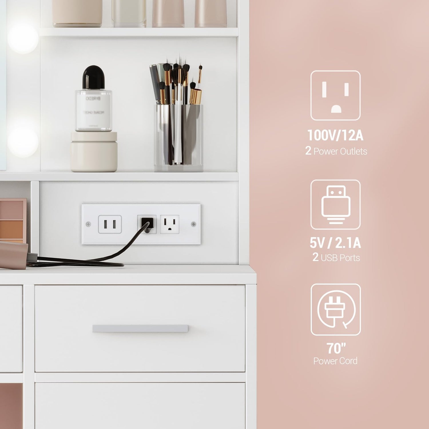 - [Dressing Table with Power Outlet] This vanity with mirror and light features two standard power outlets and two USB ports; it can simultaneously charge a hairdryer, phone, and other electronic devices, making makeup application more convenient and efficient