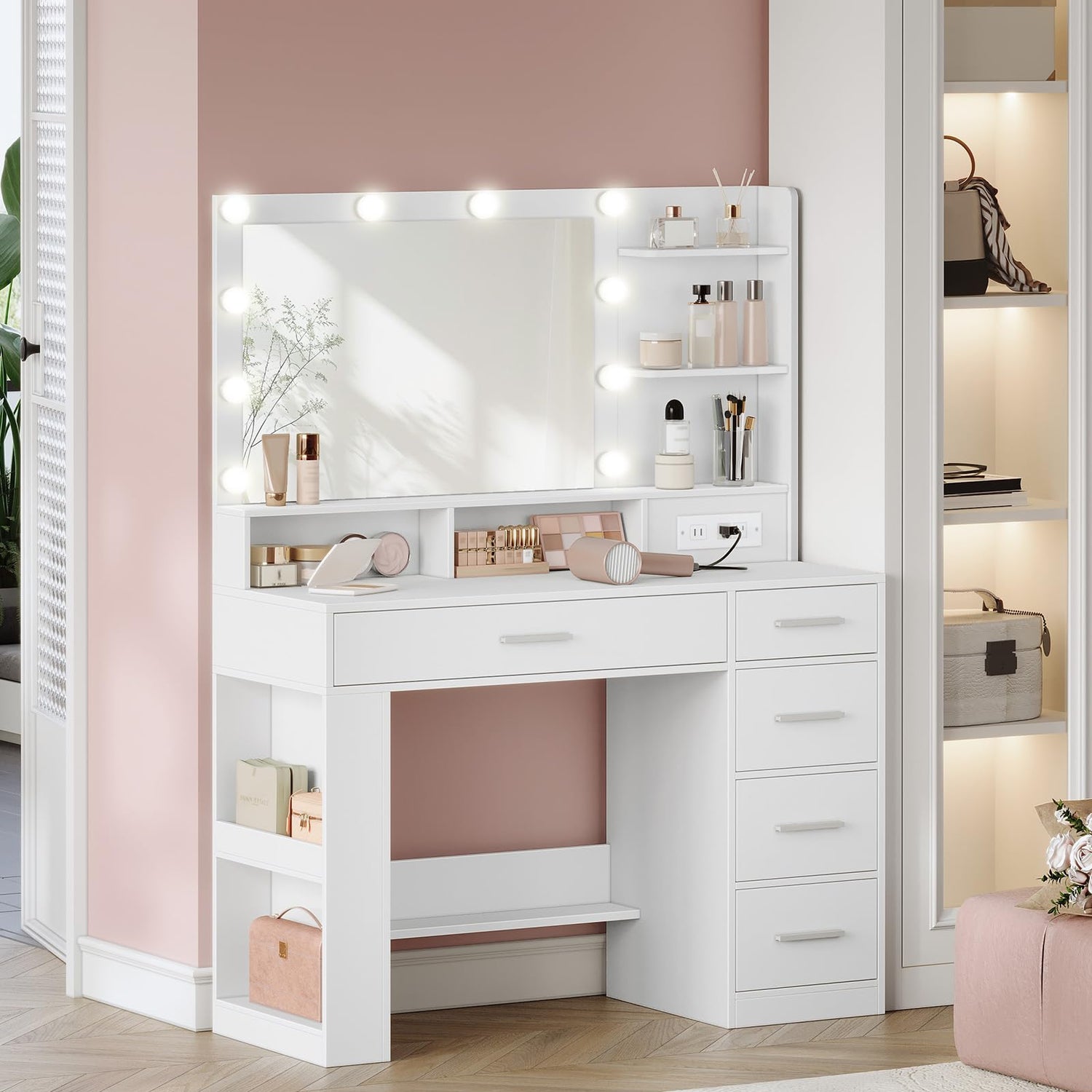 - [Abundant Storage] This dressing table offers ample storage space with a spacious 42.5-inch countertop, allowing for more flexibility when applying makeup. Six open storage areas, five drawers, and side cabinets provide easy access to makeup, open shelves display frequently used fragrances, multi-layer drawers organize jewelry and hair tools, and side cabinets easily store tall skincare bottles, ensuring each item has its own dedicated space for an efficient dressing flow