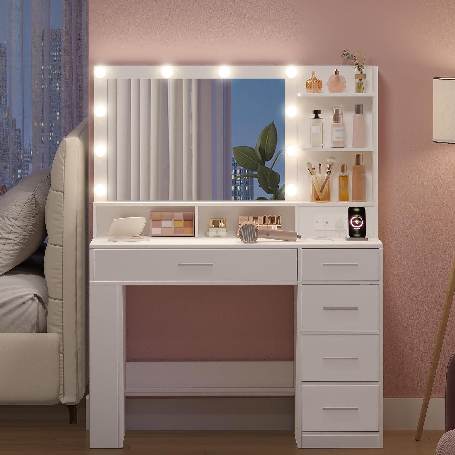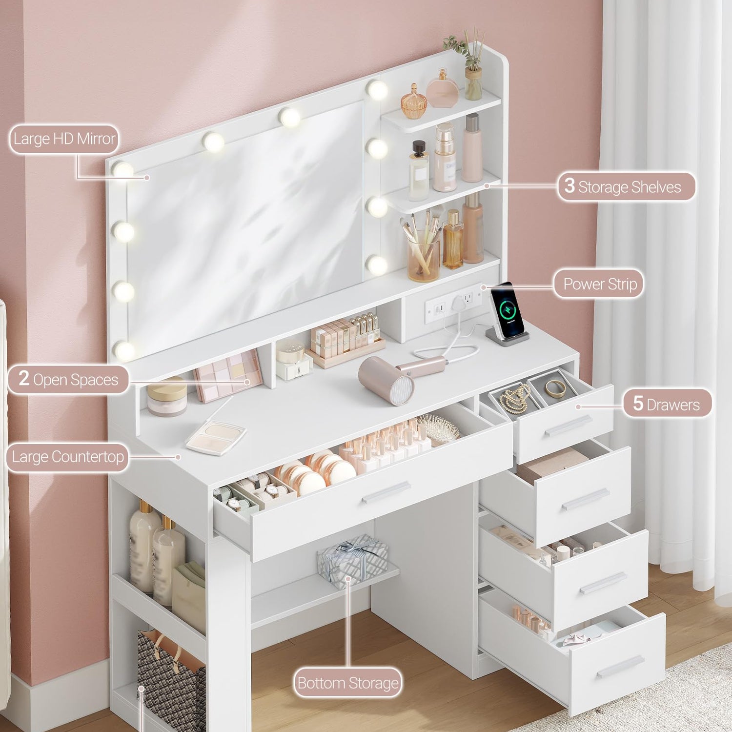 HILINSIE Vanity Desk with Large HD Mirror, Makeup Vanity with Led Lights, Dressing Table with Power Strip, 6 Storage Shelves, 5 Drawers and Side Open Storage, Simple, White