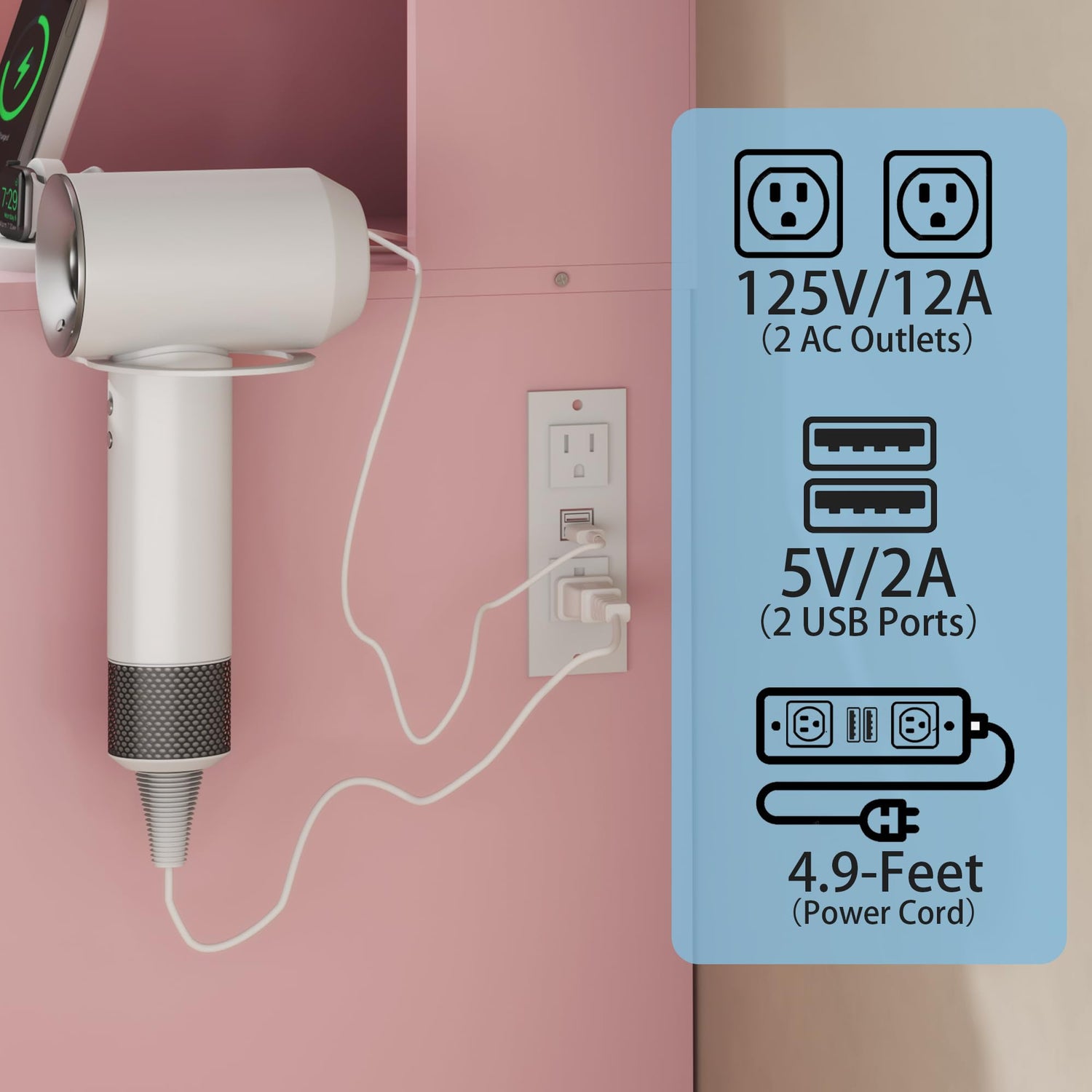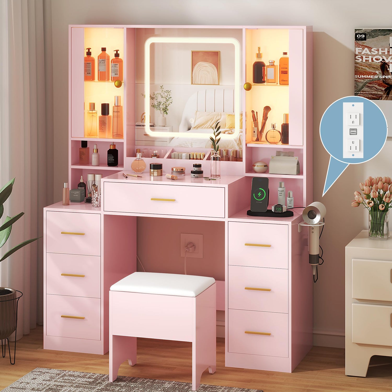 - 【VANITY WITH CHARGING STATION】Pink vanity with charging port is equipped with 2 AC power outlets and 2 USB ports to apply more charging choice for your phone, electronic devices and beauty tools when makeup. Besides, makeup vanity feature hair dryer stand near charging station so that very convenient to use hair dryer or hair curling iron in front of the vanity desk.