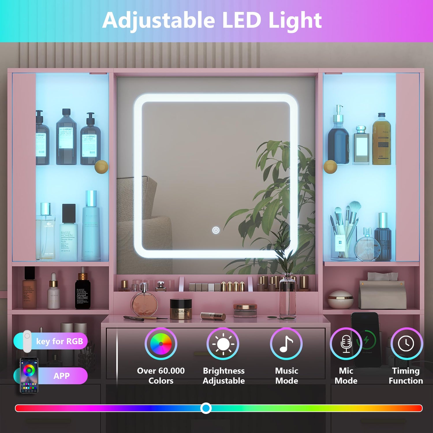 - 【GLASS DISPLAY CABINET】The vanity mirror with lights desk features 2 glass cabinets with LED RGB lights, glasses are embedded in the middle cabinets which is adjustable to suit any size of your cosmetics. RGB LED lights of makeup desk can be controlled by switches or apps, when you adjuste music mode to enjoy a concert-like lighting experience.