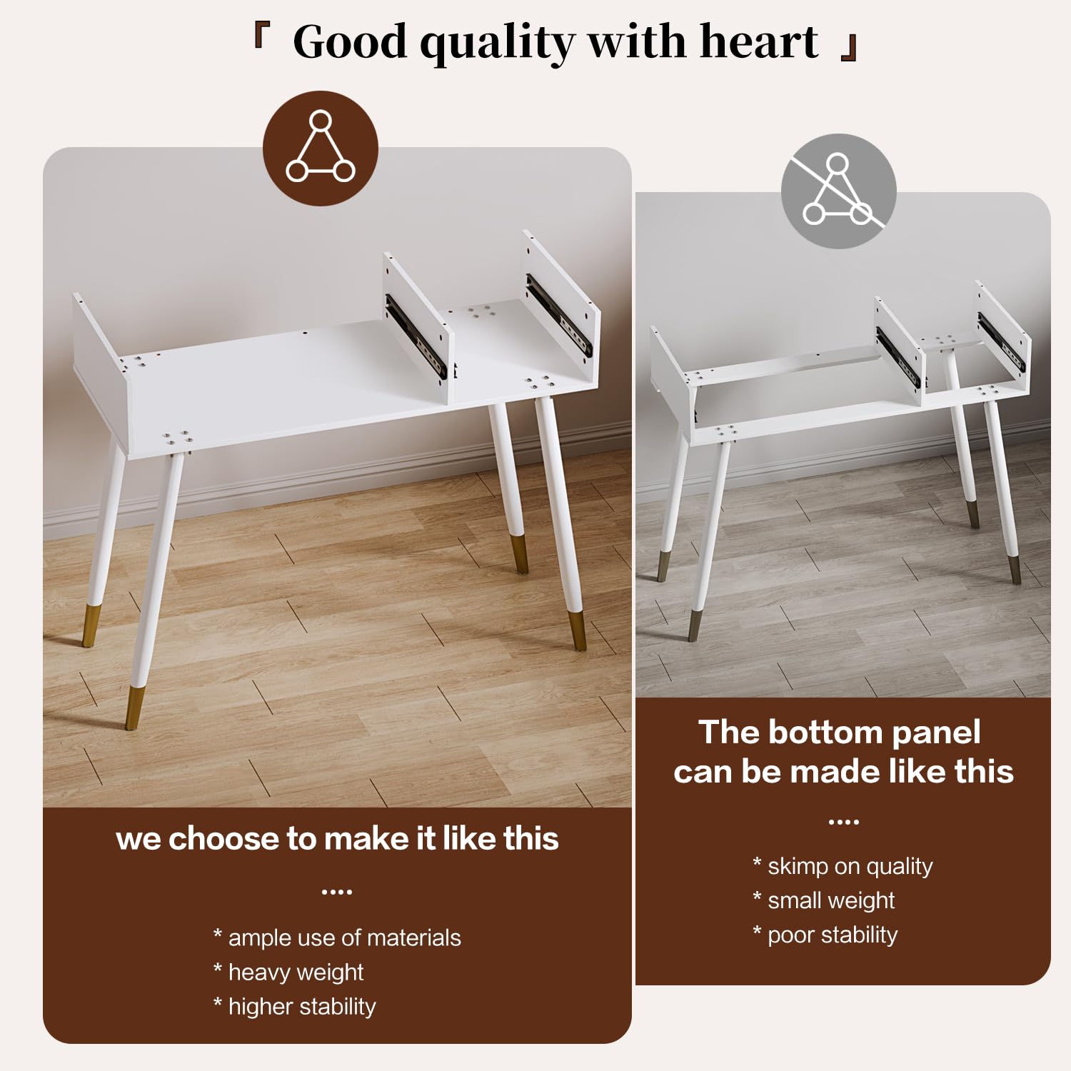 - 【Metal slides and Handles】 This white Vanity Desk is made of scratch-resistant, moisture-resistant MDF boards, and sturdy metal handles, a light wipe with a damp cloth will give the fresh look. easily on ball bearings, allowing you to effortlessly push and pull drawers to keep your items neat.