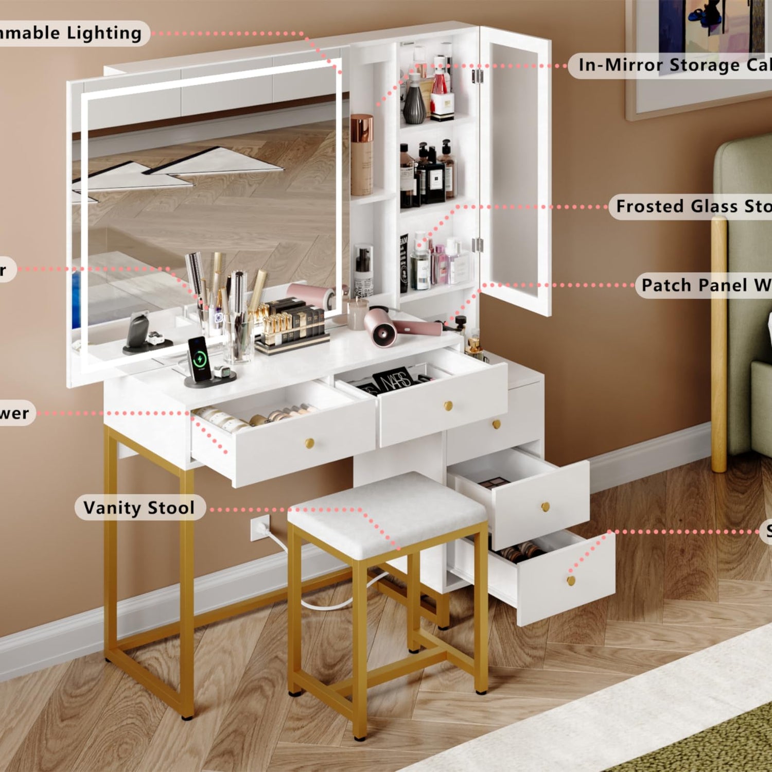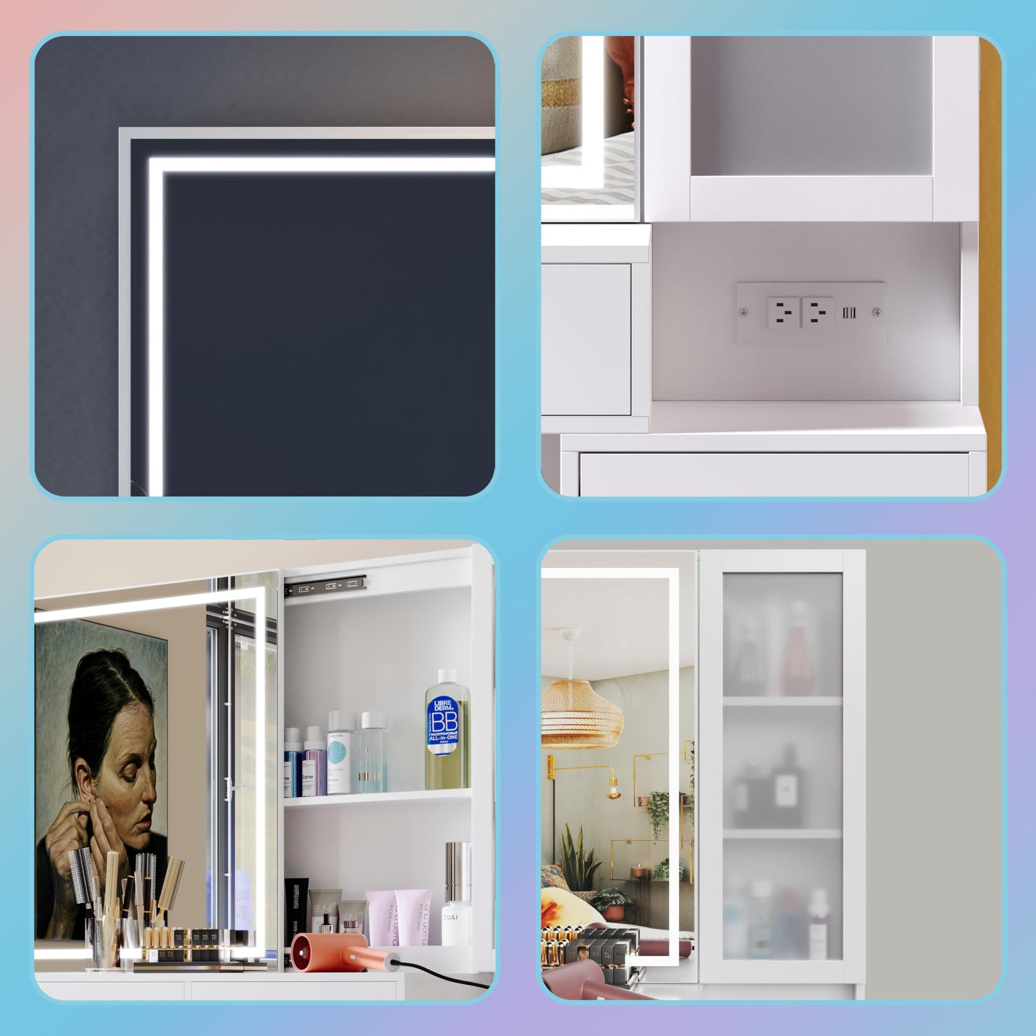Jartoil Vanity Desk with Lighted Mirror and Charging Station, Extra Large Mirror Vanity Dresser with Storage Shelves, Modern Vanity Set with Nightstand, Cushioned Stool (White-1)