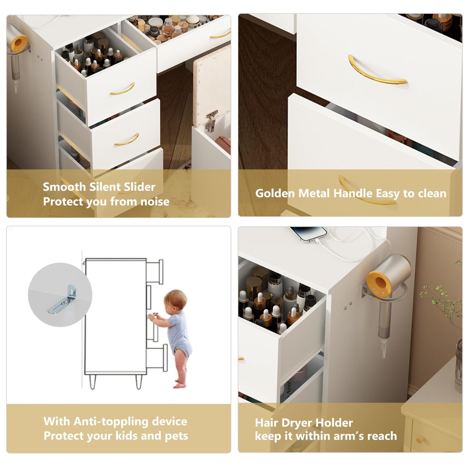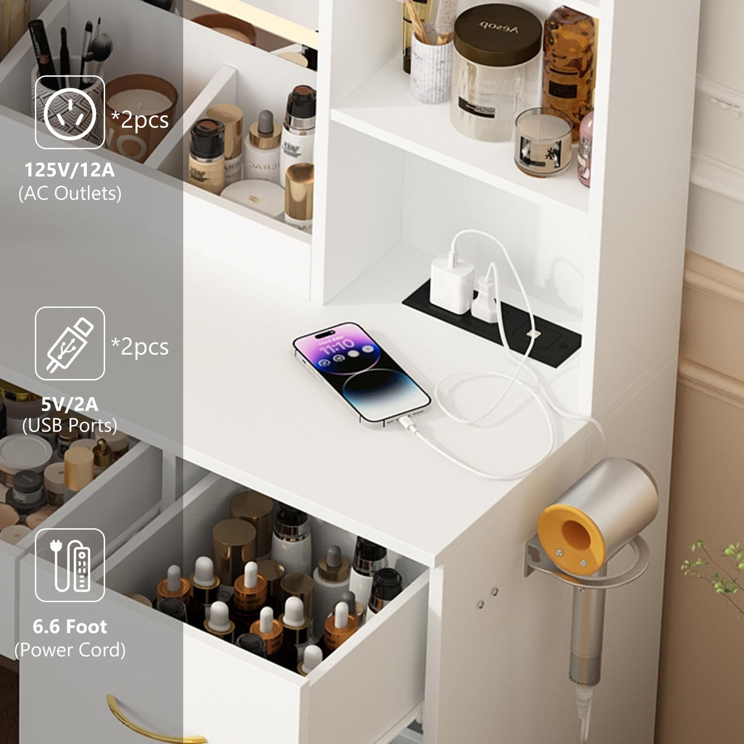 • 【Make up Desk with Charging Station and Hair Dryer Rack】Our white Vanity Desk features a charging station, includes 2 standard plug sockets and 2 USB ports to allow you to charge multiple electronic devices at the same time. and 1 hair dryer rack so your hair dryer,curling iron can be within arm’s reach; Nice vanity set for dressing room, bedroom.