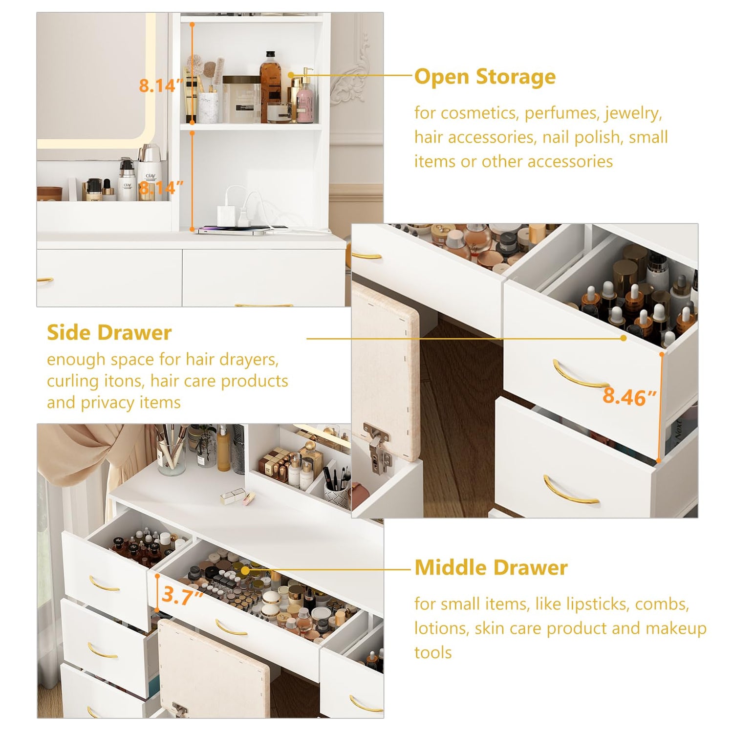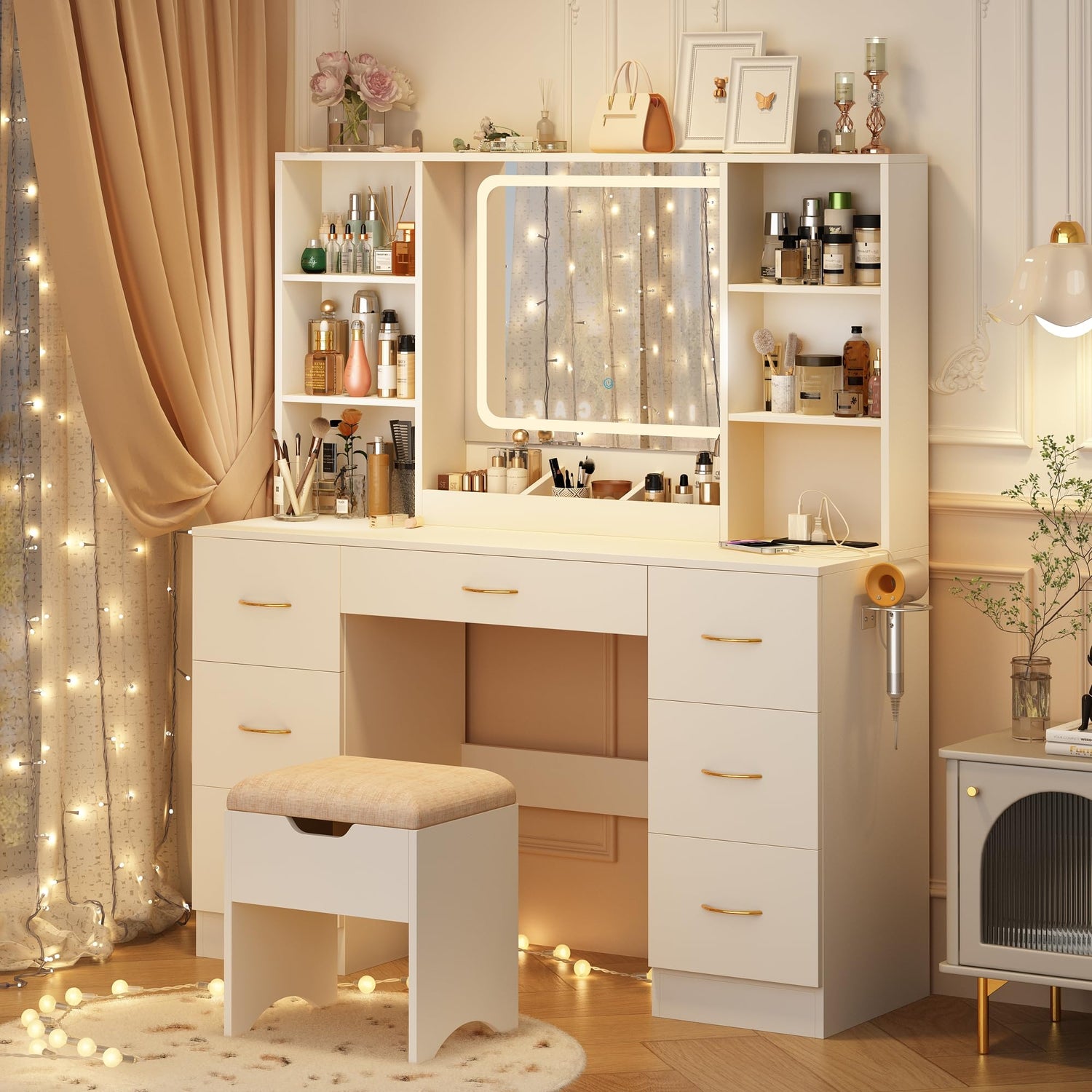 • 【Large Vanity Desk with drawers】Our large 47" make up vanity table with 7 drawers, 7 open storage shelves, large tabletop and stool with storage , provide you super large storage, you'll have plenty of room for all your beauty essentials and favorite jewelry.