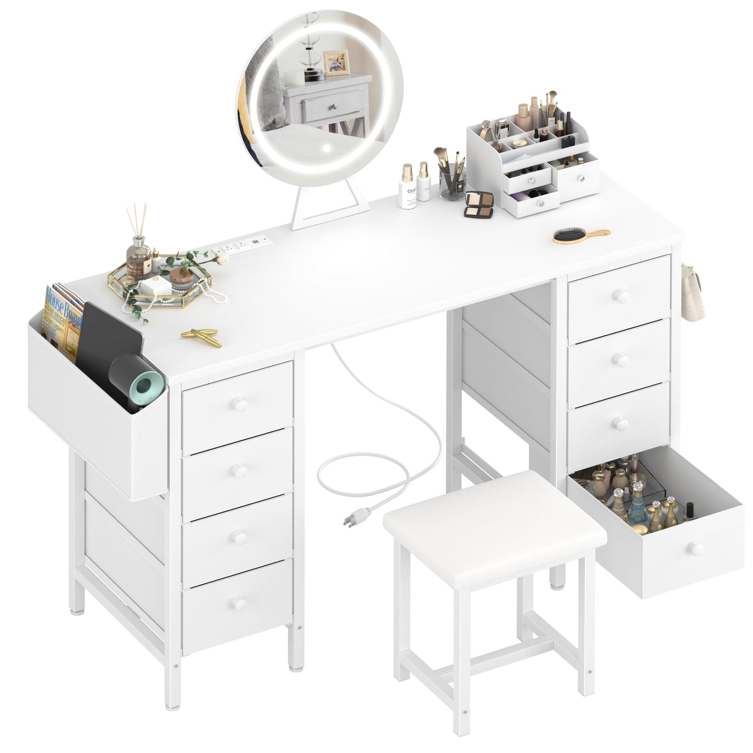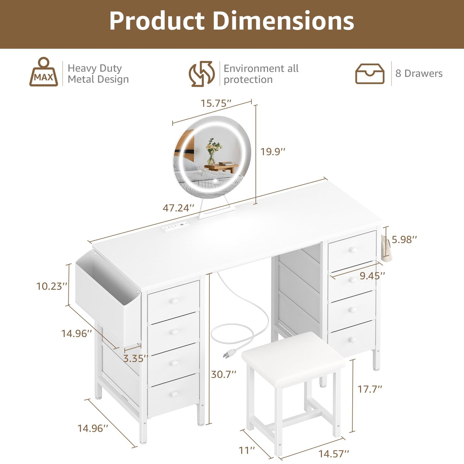 KAI-ROAD Makeup Vanity with Storage and Lighted Mirror - White Vanity Desk with Mirror and Lights, 8 Large Fabric Drawers & Power Outlet, Dressing Table Vanities Chair Set for Girls Bedroom