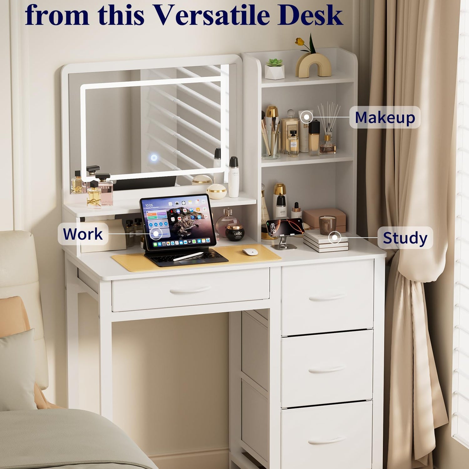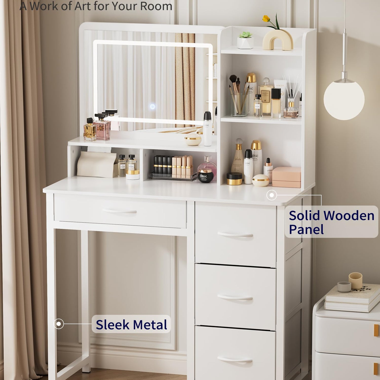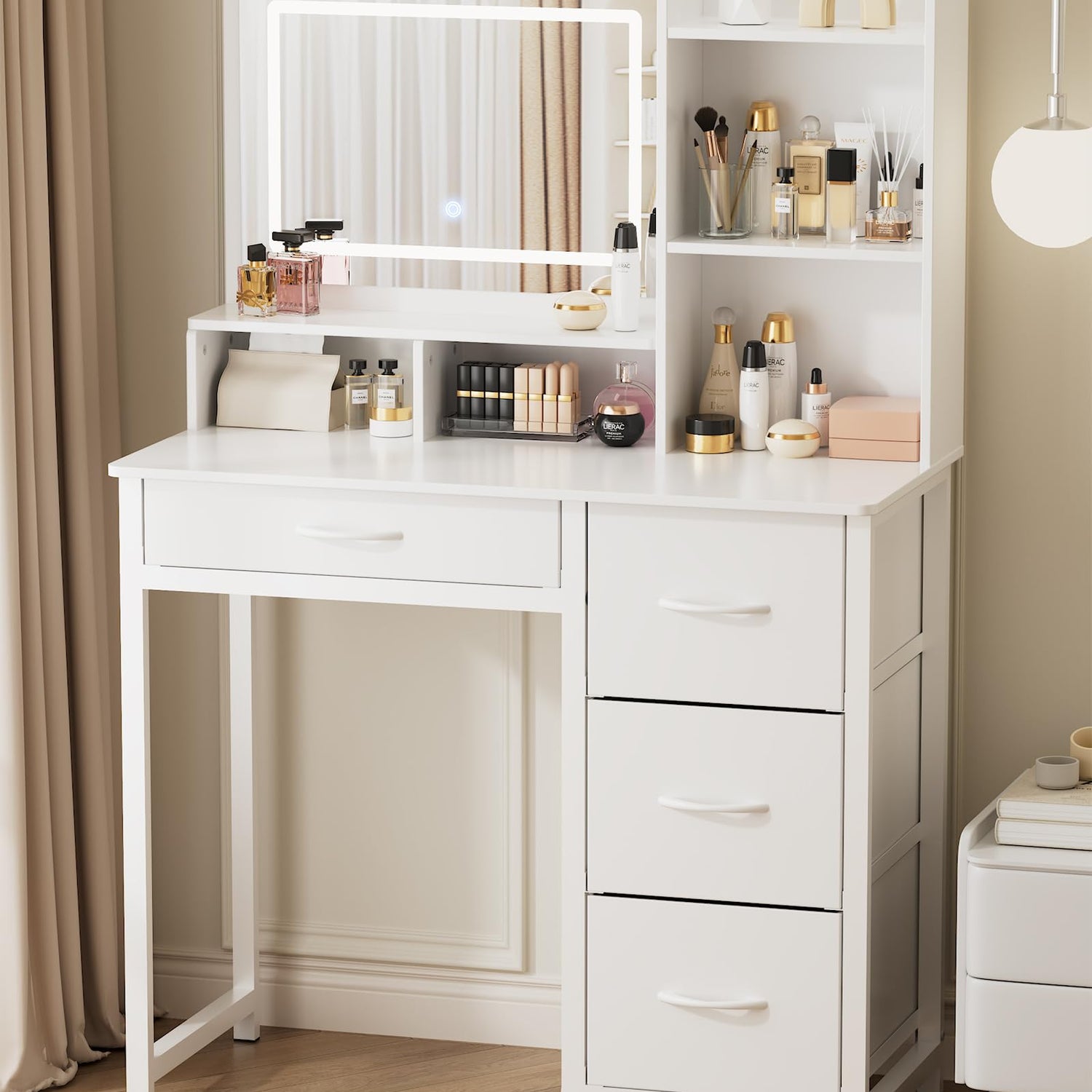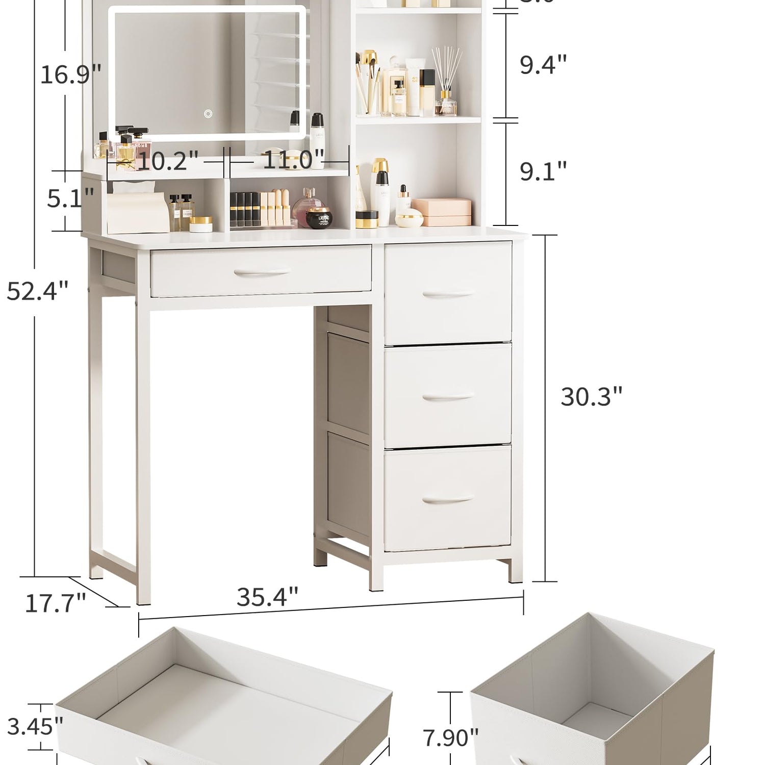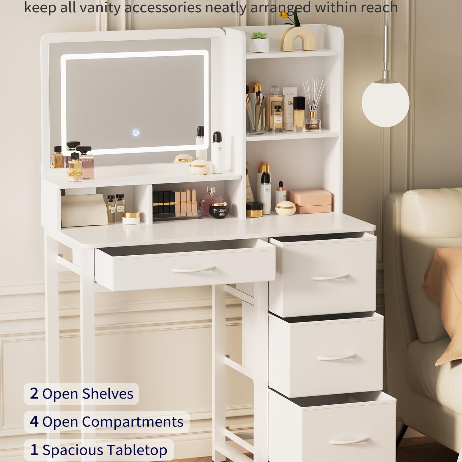 - YOUR SPACIOUS BEAUTY STATION: Say goodbye to messy countertops! This white vanity with lighted mirror offers 6 open compartments, 4 large fabric storage drawers, and a wide tabletop, giving you plenty of room to store makeup, skincare, perfumes, jewelry, and more. No more clutter, no more searching. Everything stays neatly organized and within easy reach!