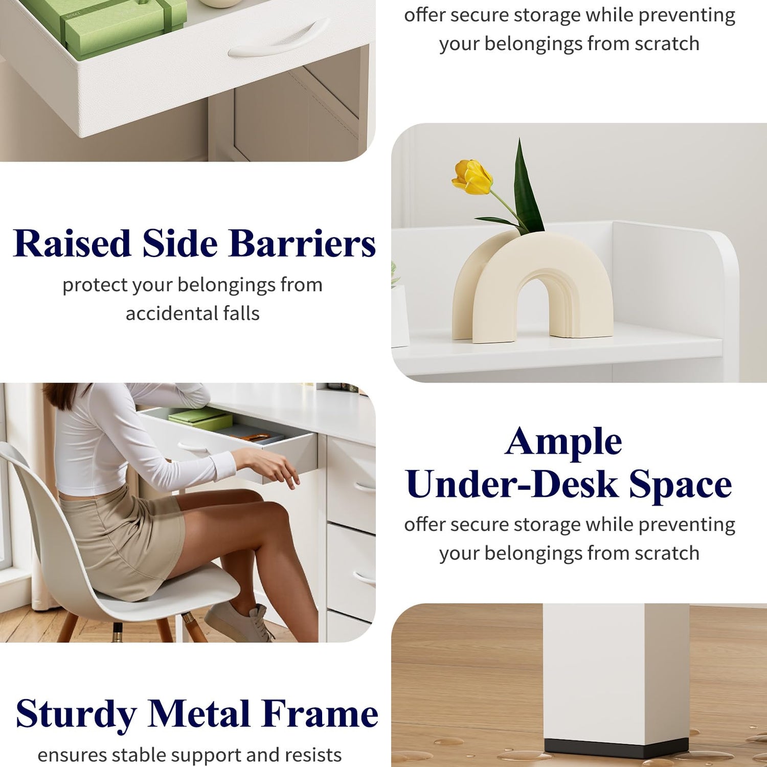 - A SMART & VERSATILE ESSENTIAL: With a spacious tabletop, this vanity desk doubles as a study desk, work table, or writing station to suit any lifestyle. Moreover, the raised side barriers prevent belongings from falling, while the ample under-desk space provides comfort and flexibility for long hours of use. Beauty, productivity, and organization—all in one elegant piece!