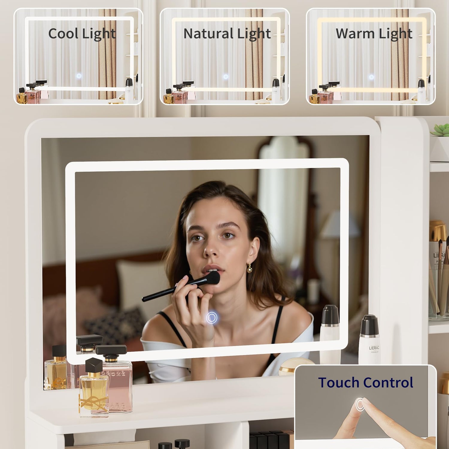 - ILLUMINATE YOUR BEAUTY: Achieve flawless lighting every time! The vanity mirror with lights is large and high-definition and features built-in LED lights with 3 adjustable color modes (cool, natural, and warm). It allows you to customize the lighting to match your makeup needs for any occasion. Touch control makes switching modes effortless!