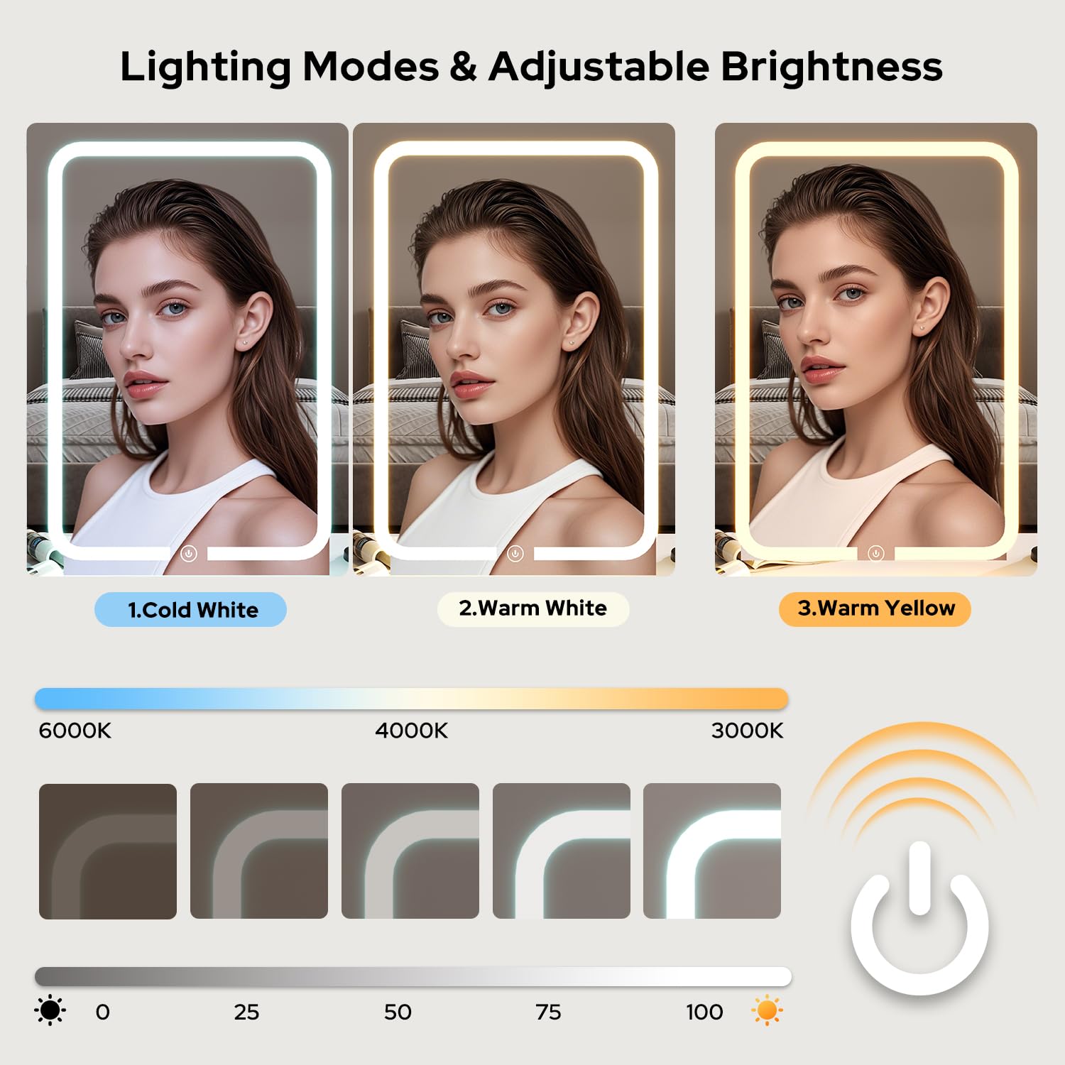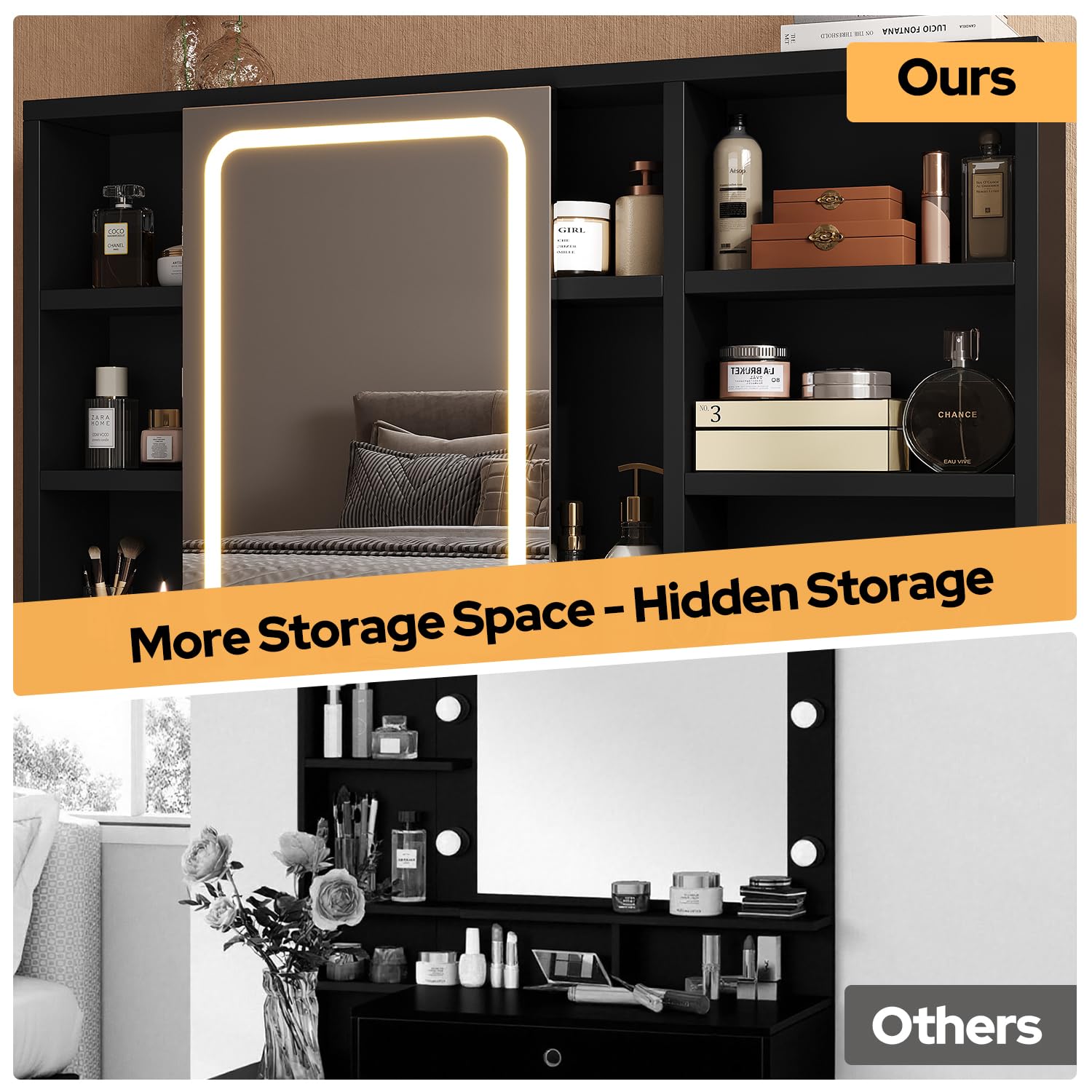- 【Sliding LED Mirror with 3 Light Modes】Get ready in any lighting with a touch-controlled LED mirror offering warm yellow, natural white, and cool white settings. Long press to adjust brightness for the perfect glow. Behind the sliding mirror, two hidden shelves offer bonus storage. This is your go-to vanity with mirror and lights for flawless makeup every time.